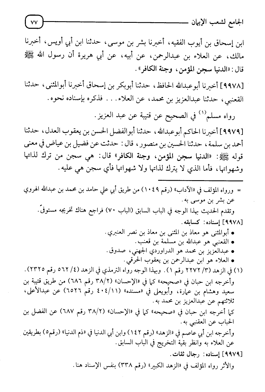 9979 - أَخْبَرَنَا الْحَاكِمُ أَبُو عَبْدِ اللهِ , ثَنَا أَبُو الْفَضْلِ الْحَسَنُ بْنُ يَعْقُوبَ الْعَدْلُ , ثَنَا أَحْمَدُ بْنُ سَلَمَةَ , ثَنَا الْحُسَيْنُ بْنُ مَنْصُورٍ , قَالَ: حُدِّثْتُ عَنْ فُضَيْلِ بْنِ عِيَاضٍ , فِي مَعْنَى قَوْلِهِ صَلَّى اللَّهُ عَلَيْهِ وَسَلَّمَ: " §الدُّنْيَا سِجْنُ الْمُؤْمِنِ وَجَنَّةُ الْكَافِرِ " , قَالَ: هِيَ سِجْنُ مَنْ تَرَكَ لَذَّاتِهَا وَشَهَوَاتِهَا , فَأَمَّا الَّذِي لَا يَتْرُكُ لَذَّاتِهَا وَلَا شَهَوْاتِهَا فَأَيُّ سِجْنٍ هِيَ عَلَيْهِ