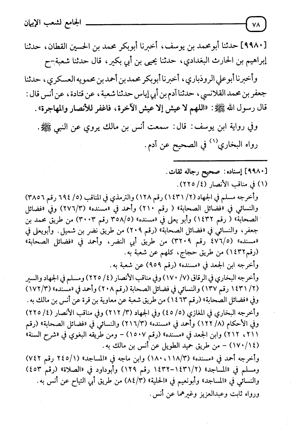 9980 - حَدَّثَنَا أَبُو مُحَمَّدِ بْنُ يُوسُفَ , أَنَا أَبُو بَكْرٍ مُحَمَّدُ بْنُ الْحُسَيْنِ الْقَطَّانُ , ثَنَا إِبْرَاهِيمُ بْنُ الْحَارِثِ الْبَغْدَادِيُّ , ثَنَا يَحْيَى بْنُ أَبِي بُكَيْرٍ , قَالَ: ثَنَا شُعْبَةُ , ح وَأَخْبَرَنَا أَبُو عَلِيٍّ الرُّوذْبَارِيُّ , ثَنَا أَبُو بَكْرٍ مُحَمَّدُ بْنُ أَحْمَدَ بْنِ مَحْمَوَيْهِ الْعَسْكَرِيُّ , ثَنَا جَعْفَرُ بْنُ مُحَمَّدٍ الْقَلَانِسِيُّ , ثَنَا آدَمُ بْنُ أَبِي إِيَاسٍ , ثَنَا شُعْبَةُ , عَنْ قَتَادَةَ , عَنْ أَنَسٍ قَالَ: قَالَ رَسُولُ اللهِ صَلَّى اللَّهُ عَلَيْهِ وَسَلَّمَ: §" اللهُمَّ لَا عَيْشَ إِلَّا عَيْشُ الْآخِرَةِ فَاغْفِرْ لِلْأَنْصَارِ وَالْمُهَاجِرَةِ " وَفِي رِوَايَةِ ابْنِ يُوسُفَ قَالَ: سَمِعْتُ أَنَسَ بْنَ مَالِكٍ يَرْوِي عَنِ النَّبِيِّ صَلَّى اللَّهُ عَلَيْهِ وَسَلَّمَ رَوَاهُ الْبُخَارِيُّ فِي الصَّحِيحِ , عَنْ آدَمَ