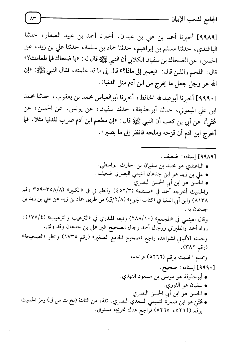 9989 - أَخْبَرَنَا عَلِيُّ بْنُ أَحْمَدَ بْنِ عَبْدَانَ , ثَنَا أَحْمَدُ بْنُ عُبَيْدٍ الصَّفَّارُ , ثَنَا الْبَاغَنْدِيُّ , ثَنَا مُسْلِمُ بْنُ إِبْرَاهِيمَ , ثَنَا حَمَّادُ بْنُ سَلَمَةَ , ثَنَا عَلِيُّ بْنُ زَيْدٍ , عَنِ الْحَسَنِ، عَنِ الضَّحَّاكِ بْنِ سُفْيَانَ الْكِلَابِيِّ , أَنَّ النَّبِيَّ صَلَّى اللَّهُ عَلَيْهِ وَسَلَّمَ قَالَ لَهُ: " يَا ضَحَّاكُ , فَمَا طَعَامُكَ؟ " , قَالَ: اللَّحْمُ وَاللَّبَنُ. قَالَ: " ثُمَّ يَصِيرُ إِلَى مَاذَا؟ " , قَالَ: إِلَى مَا قَدْ عَلِمْتَهُ. فَقَالَ النَّبِيُّ صَلَّى اللَّهُ عَلَيْهِ وَسَلَّمَ: §" إِنَّ عِنْدَ اللهِ عَزَّ وَجَلَّ مَا يَخْرُجُ مِنَ ابْنِ آدَمَ مِثْلُ الدُّنْيَا "