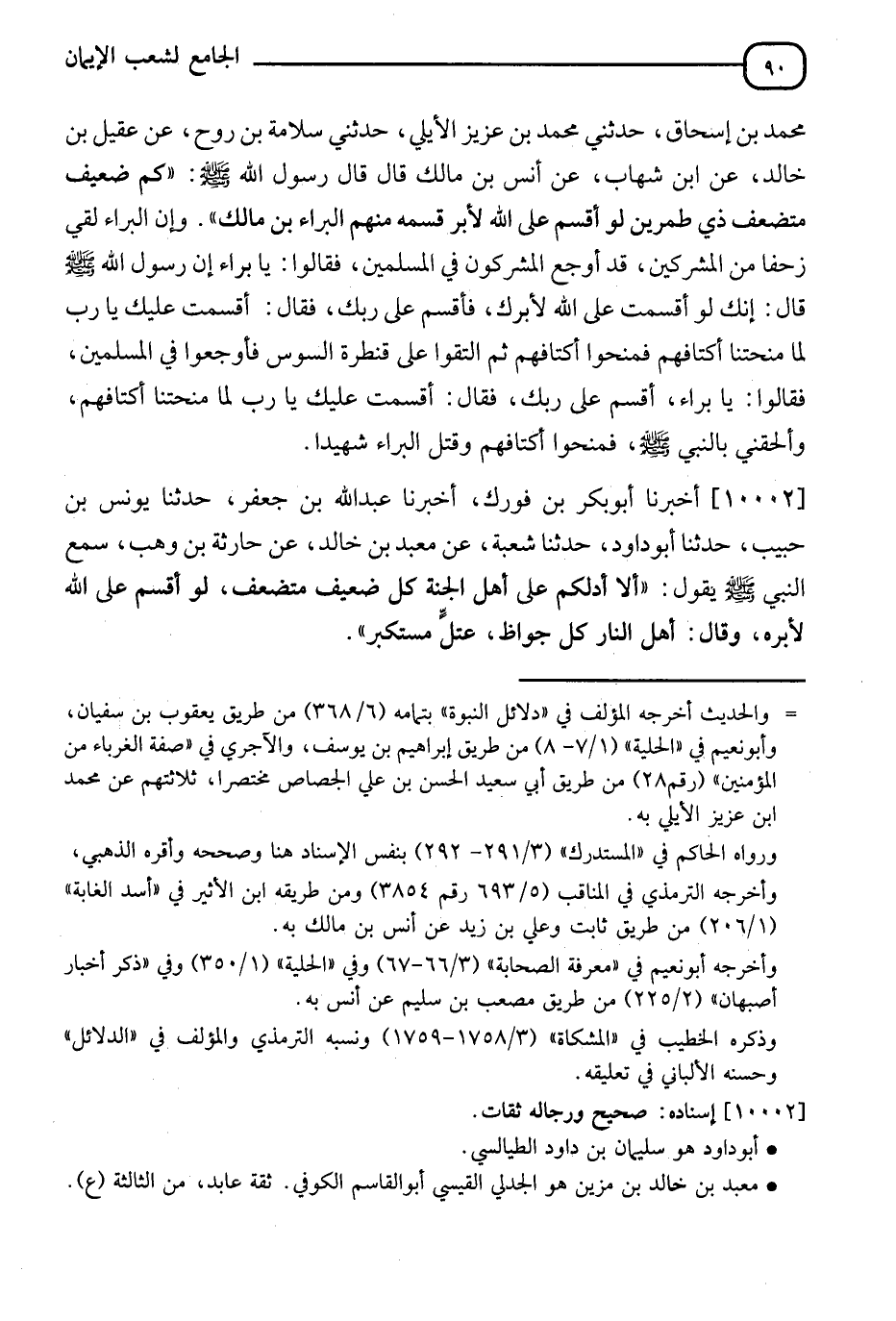 10002 - أَخْبَرَنَا أَبُو بَكْرِ بْنُ فُورَكٍ، أَنَا عَبْدُ اللهِ بْنُ جَعْفَرٍ، ثَنَا يُونُسُ بْنُ حَبِيبٍ، ثَنَا أَبُو دَاوُدَ، ثَنَا شُعْبَةُ، عَنْ مَعْبِدِ بْنِ خَالِدٍ، عَنْ حَارِثَةَ بْنِ وَهْبٍ، سَمِعَ النَّبِيَّ صَلَّى اللَّهُ عَلَيْهِ وَسَلَّمَ يَقُولُ: §" أَلَا أَدُلُّكُمْ عَلَى أَهْلِ الْجَنَّةِ؟ كُلُّ ضَعِيفٍ مُتَضَعِّفٍ لَوْ أَقْسَمَ عَلَى اللهِ لَأَبَرَّهُ " وَقَالَ: " أَهْلُ النَّارِ كُلُّ جَوَّاظٍ عُتُلٍّ مُسْتَكْبِرٍ ". -[91]- أَخْرَجَاهُ فِي الصَّحِيحِ مِنْ حَدِيثِ غُنْدَرٍ، عَنْ شُعْبَةَ