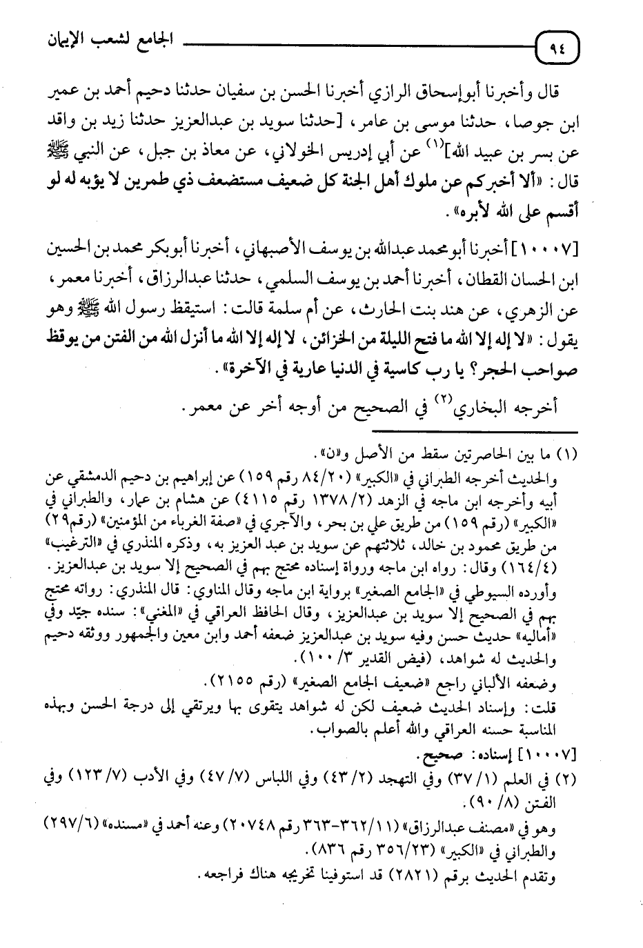 10007 - أَخْبَرَنَا أَبُو مُحَمَّدٍ عَبْدُ اللهِ بْنُ يُوسُفَ الْأَصْبَهَانِيُّ، أَنَا أَبُو بَكْرٍ مُحَمَّدُ بْنُ الْحُسَيْنِ بْنِ الْحَسَنِ الْقَطَّانُ، أَنَا أَحْمَدُ بْنُ يُوسُفَ السَّلَمِيُّ، ثَنَا عَبْدُ الرَّزَّاقِ، أَنَا مَعْمَرٌ، عَنِ الزُّهْرِيِّ، عَنْ هِنْدِ بِنْتِ الْحَارِثِ، عَنْ أُمِّ سَلَمَةَ، قَالَتِ: اسْتَيْقَظَ رَسُولُ اللهِ صَلَّى اللَّهُ عَلَيْهِ وَسَلَّمَ ذَاتَ لَيْلَةٍ وَهُوَ يَقُولُ: " §لَا إِلَهَ إِلَّا اللهُ، مَا فُتِحَ اللَّيْلَةَ مِنَ الْخَزَائِنِ، لَا إِلَهَ إِلَّا اللهُ، مَا أَنْزَلَ اللهُ مِنَ الْفِتَنِ مَنْ يُوقِظُ صَوَاحِبَ الْحُجَرِ، يَا رُبَّ كَاسِيَةٍ فِي الدُّنْيَا عَارِيَةٍ فِي الْآخِرَةِ ". أَخْرَجَهُ الْبُخَارِيُّ فِي الصَّحِيحِ مِنْ أَوْجُهٍ أُخْرَى عَنْ مَعْمَرٍ