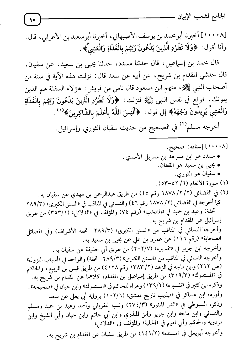 10008 - أَخْبَرَنَا أَبُو مُحَمَّدِ بْنُ يُوسُفَ الْأَصْبَهَانِيُّ، ثَنَا أَبُو سَعِيدِ بْنُ الْأَعْرَابِيِّ، قَالَ: وَأَنَا أَقُولُ {وَلَا تَطْرُدِ الَّذِينَ يَدْعُونَ رَبَّهُمْ بِالْغَدَاةِ} [الأنعام: 52] وَالْعَشِيِّ، قَالَ مُحَمَّدُ بْنُ إِسْمَاعِيلَ، قَالَ: ثَنَا مُحَمَّدُ بْنُ مُسَدَّدٍ، ثَنَا يَحْيَى بْنُ سَعِيدٍ، عَنْ سُفْيَانَ، قَالَ: حَدَّثَنِي الْمِقْدَامُ بْنُ شُرَيْحٍ، عَنْ أَبِيهِ، عَنْ سَعْدٍ، قَالَ لِي: " نَزَلَتْ هَذِهِ الْآيَةُ فِي سِتَّةٍ مِنْ أَصْحَابِ رَسُولِ اللهِ صَلَّى اللَّهُ عَلَيْهِ وَسَلَّمَ مِنْهُمُ ابْنُ مَسْعُودٍ، قَالَ نَاسٌ مِنْ قُرَيْشٍ: هَؤُلَاءِ السَّفِلَةُ هُمُ الَّذِينَ يَلُونَكَ، فَوَقَعَ فِي نَفْسِ النَّبِيِّ صَلَّى اللَّهُ عَلَيْهِ وَسَلَّمَ، فَنَزَلَتْ {§وَلَا تَطْرُدِ الَّذِينَ يَدْعُونَ رَبَّهُمْ بِالْغَدَاةِ وَالْعَشِيِّ يُرِيدُونَ وَجْهَهُ} [الأنعام: 52] إِلَى قَوْلِهِ: {أَلَيْسَ اللهُ بِأَعْلَمَ بِالشَّاكِرِينَ} [الأنعام: 53] ". أَخْرَجَهُ مُسْلِمٌ فِي الصَّحِيحِ، مِنْ حَدِيثِ سُفْيَانَ الثَّوْرِيِّ، وَإِسْرَائِيلَ