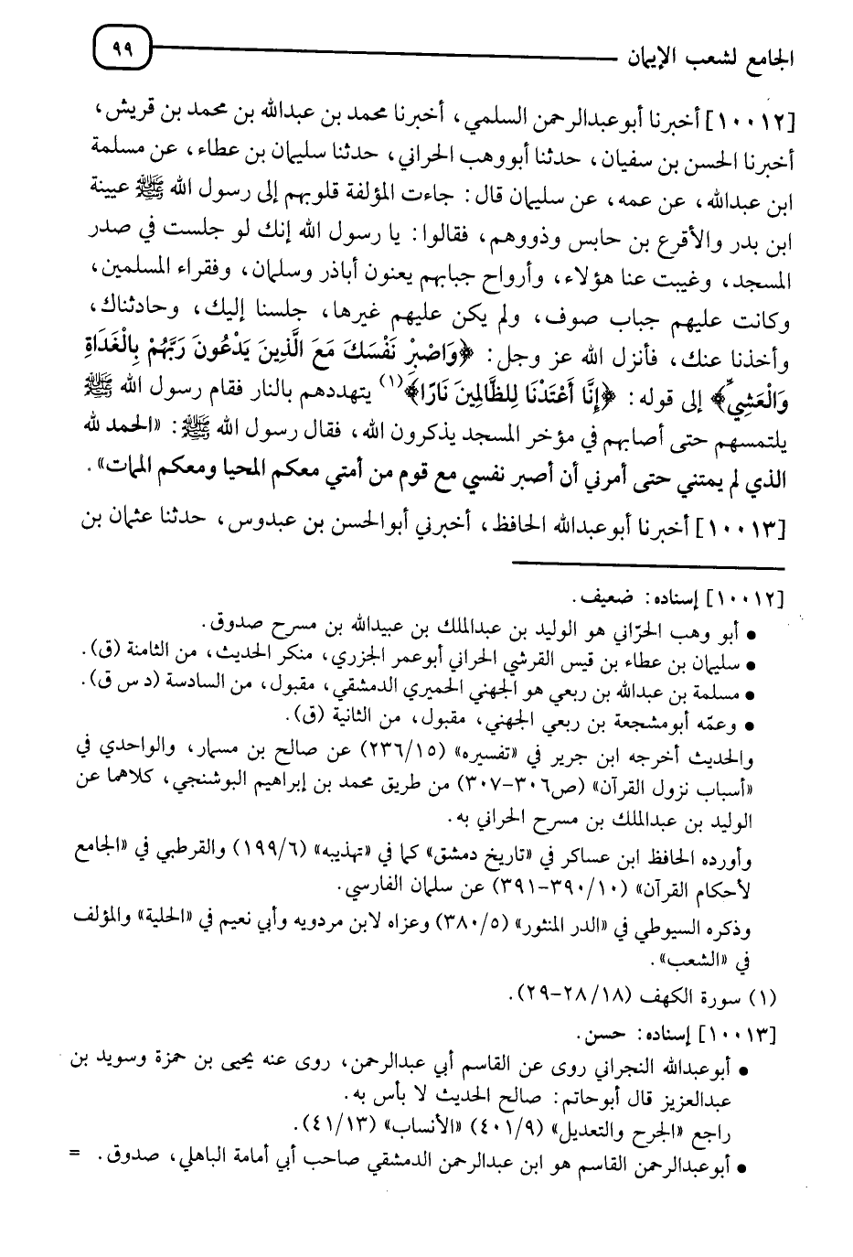 10012 - أَخْبَرَنَا أَبُو عَبْدِ الرَّحْمَنِ السَّلَمِيُّ، أَنَا مُحَمَّدُ بْنُ عَبْدِ اللهِ بْنِ مُحَمَّدِ بْنِ قُرَيْشٍ، أَنَا الْحَسَنُ بْنُ سُفْيَانَ، ثَنَا أَبُو وَهْبٍ الْحَرَّانِيُّ، ثَنَا سُلَيْمَانُ بْنُ عَطَاءٍ، عَنْ سَلَمَةَ بْنِ عَبْدِ اللهِ، عَنْ عَمِّهِ، عَنْ سَلْمَانَ، قَالَ: جَاءَتِ الْمُؤَلَّفَةُ قُلُوبُهُمْ إِلَى رَسُولِ اللهِ صَلَّى اللَّهُ عَلَيْهِ وَسَلَّمَ، عُيَيْنَةُ بْنُ بَدْرٍ وَالْأَقْرَعُ بْنُ حَابِسٍ وَذَوُوهُمْ فَقَالُوا: يَا رَسُولَ اللهِ، أَنَّكَ لَوْ جَلَسْتَ فِي صَدْرِ الْمَسْجِدِ وَنَفَيْتَ عَنَّا هَؤُلَاءِ وَأَرْوَاحَ جِبَابِهِمْ - يَعْنُونَ أَبَا ذَرٍّ وَسَلْمَانَ وَفُقَرَاءَ الْمُسْلِمِينَ -، وَكَانَتْ عَلَيْهِمْ جِبَابُ صُوفٍ، وَلَمْ يَكُنْ عَلَيْهِمْ غَيْرُهَا، جَلَسْنَا إِلَيْكَ وَحَادَثْنَاكَ وَأَخَذْنَا عَنْكَ، فَأَنْزَلَ اللهُ عَزَّ وَجَلَّ: {وَاصْبِرْ نَفْسَكَ مَعَ الَّذِينَ يَدْعُونَ رَبَّهُمْ بِالْغَدَاةِ وَالْعَشِيِّ} [الكهف: 28] إِلَى قَوْلِهِ: {أَعْتَدْنَا لِلظَّالِمِينَ نَارًا} [الكهف: 29] يَتَهَدَّدُهُمْ بِالنَّارِ، فَقَامَ رَسُولُ اللهِ صَلَّى اللَّهُ عَلَيْهِ وَسَلَّمَ يَلْتَمِسُهُمْ حَتَّى أَصَابَهُمْ فِي مُؤَخِّرِ الْمَسْجِدِ يَذْكُرُونَ اللهَ، فَقَالَ رَسُولُ اللهِ صَلَّى اللَّهُ عَلَيْهِ وَسَلَّمَ: §" الْحَمْدُ لِلَّهِ الَّذِي لَمْ يُمِتْنِي حَتَّى أَمَرَنِي أَنْ أَصْبِرَ نَفْسِي مَعَ قَوْمٍ مِنْ أُمَّتِي، مَعَكُمُ الْمَحْيَا وَمَعَكُمُ الْمَمَاتُ "