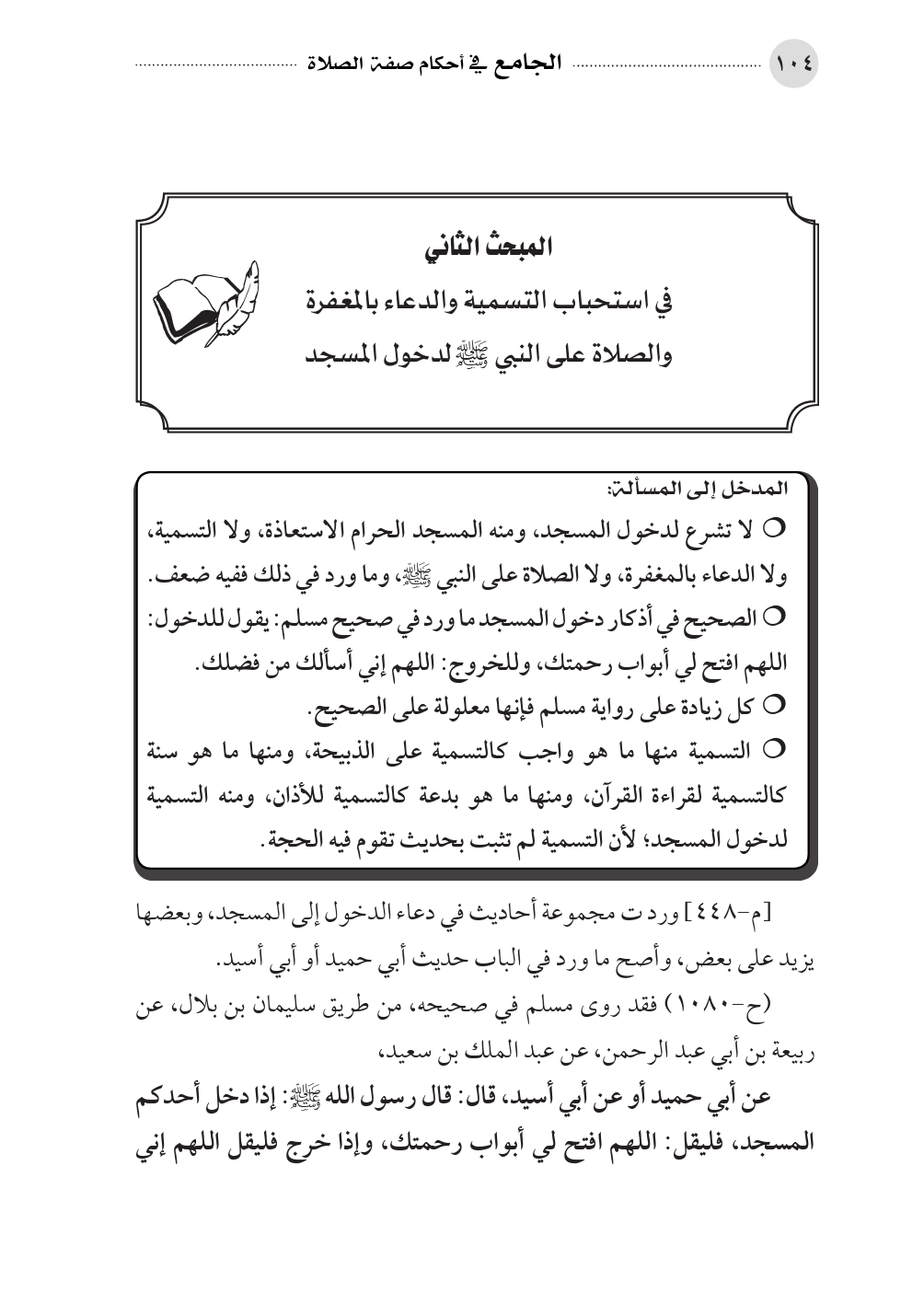 المبحث الثاني في استحباب التسمية والدعاء بالمغفرة والصلاة على النبي صلى الله عليه وسلم لدخول المسجد