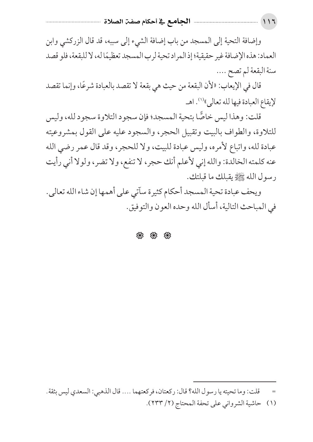 وإضافة التحية إلى المسجد من باب إضافة الشيء إلى سببه، قد قال الزركشي وابن العماد: هذه الإضافة غير حقيقية؛ إذ المراد تحية لرب المسجد تعظيمًا له، لا للبقعة، فلو قصد سنة البقعة لم تصح ....