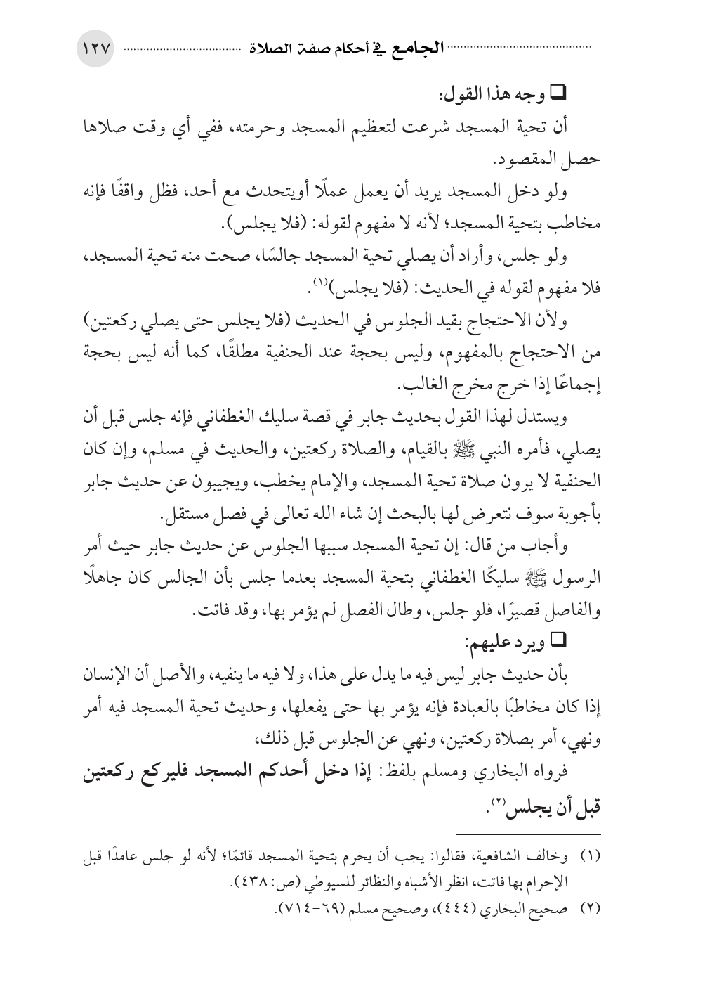 وأجاب من قال: إن تحية المسجد سببها الجلوس عن حديث جابر حيث أمر الرسول صلى الله عليه وسلم سليكًا الغطفاني بتحية المسجد بعدما جلس بأن الجالس كان جاهلًا والفاصل قصيرًا، فلو جلس، وطال الفصل لم يؤمر بها، وقد فاتت.