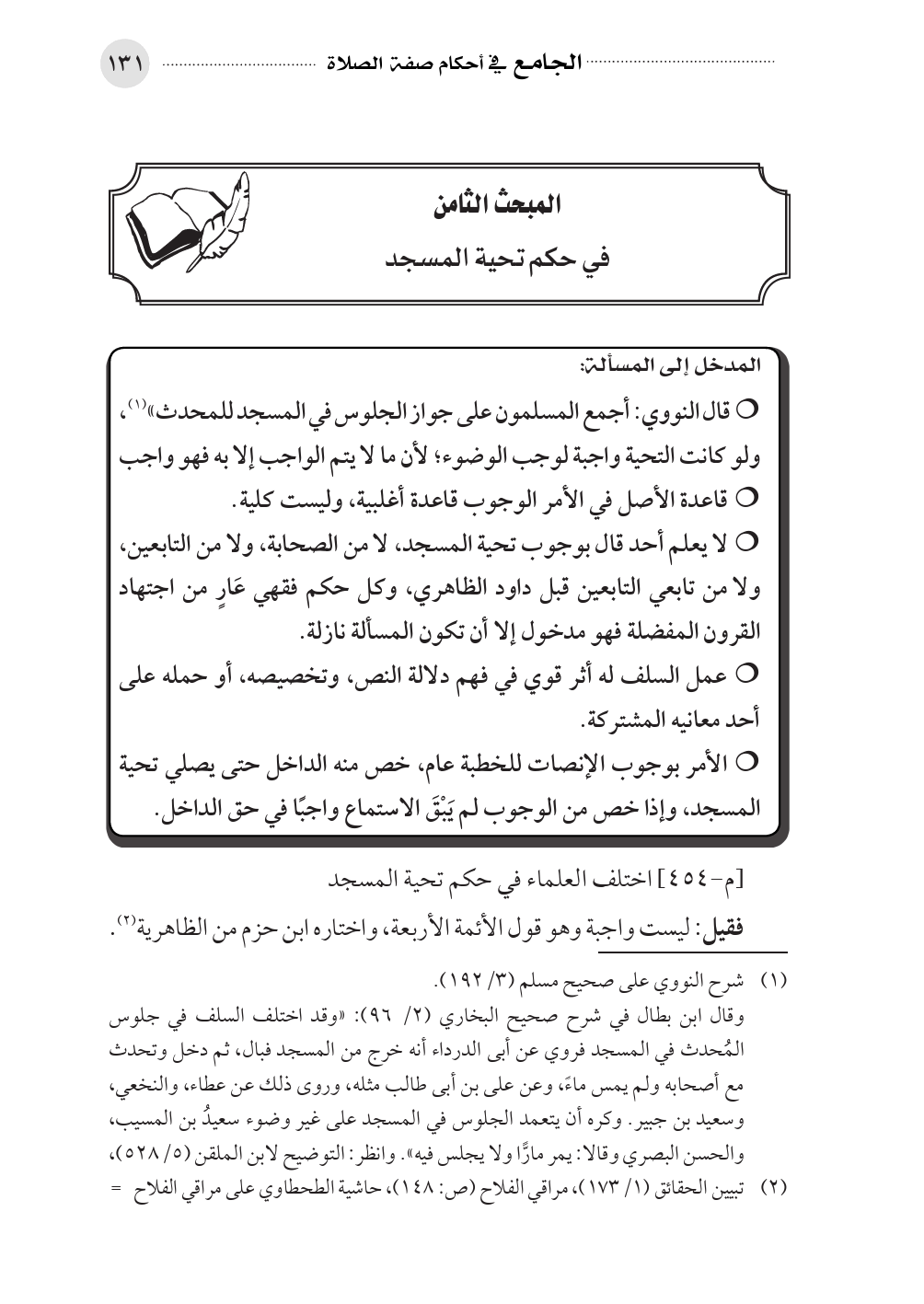 • لا يعلم أحد قال بوجوب تحية المسجد، لا من الصحابة، ولا من التابعين، ولا من تابعي التابعين قبل داود الظاهري، وكل حكم فقهي عَارٍ من اجتهاد القرون المفضلة فهو مدخول إلا أن تكون المسألة نازلة.
