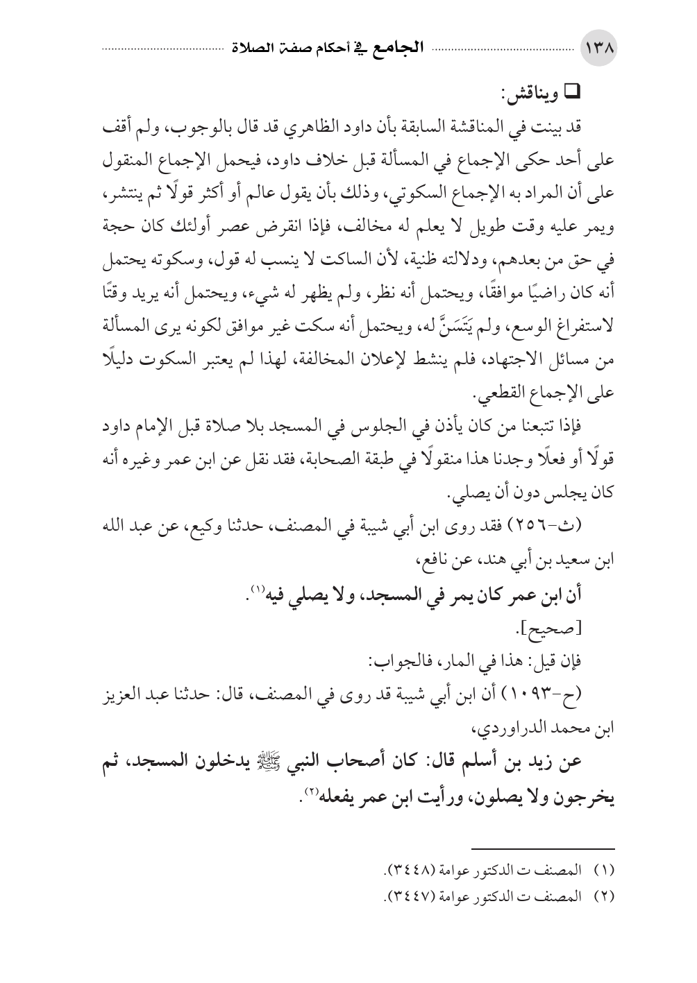 فإذا تتبعنا من كان يأذن في الجلوس في المسجد بلا صلاة قبل الإمام داود قولًا أو فعلًا وجدنا هذا منقولًا في طبقة الصحابة، فقد نقل عن ابن عمر وغيره أنه كان يجلس دون أن يصلي.