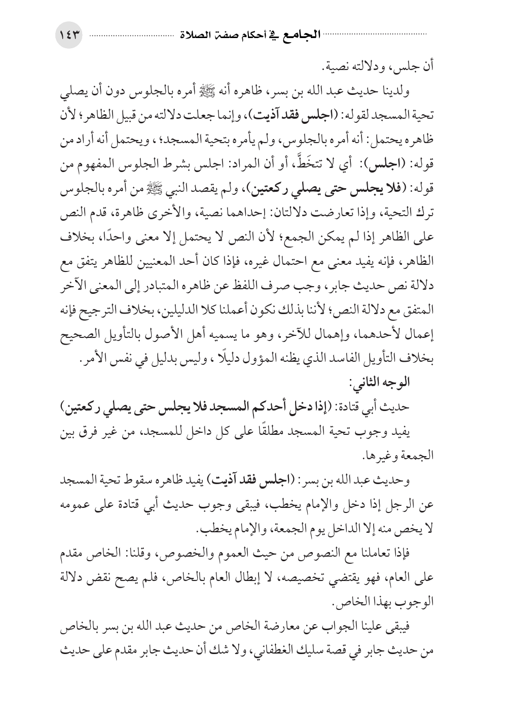 فيبقى علينا الجواب عن معارضة الخاص من حديث عبد الله بن بسر بالخاص من حديث جابر في قصة سليك الغطفاني، ولا شك أن حديث جابر مقدم على حديث