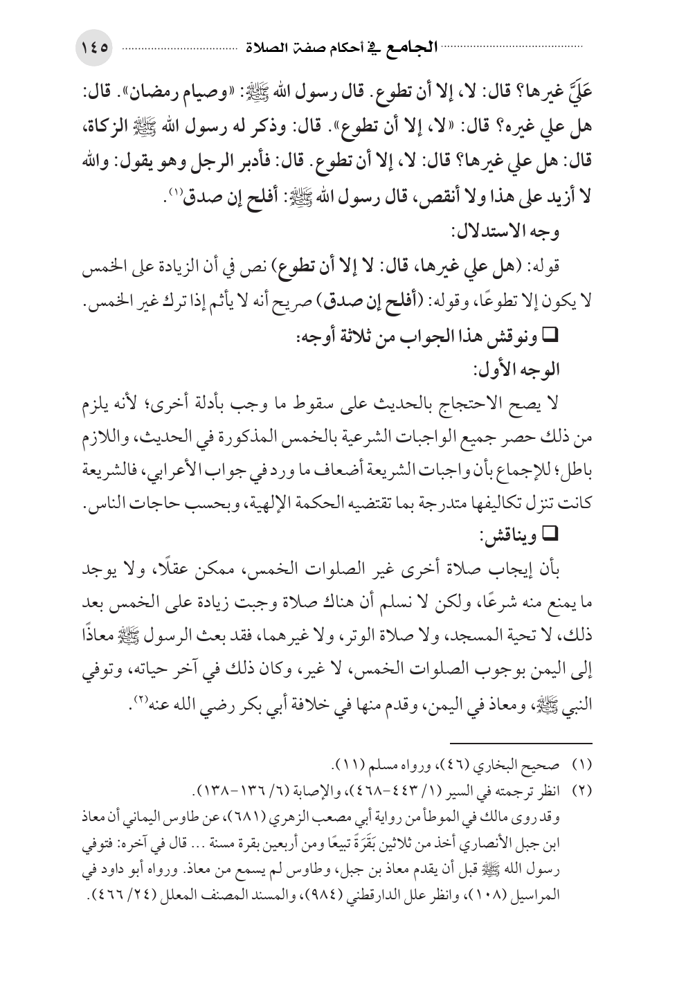 بأن إيجاب صلاة أخرى غير الصلوات الخمس، ممكن عقلًا، ولا يوجد ما يمنع منه شرعًا، ولكن لا نسلم أن هناك صلاة وجبت زيادة على الخمس بعد ذلك، لا تحية المسجد، ولا صلاة الوتر، ولا غيرهما، فقد بعث الرسول صلى الله عليه وسلم معاذًا إلى اليمن بوجوب الصلوات الخمس، لا غير، وكان ذلك في آخر حياته، وتوفي النبي صلى الله عليه وسلم، ومعاذ في اليمن، وقدم منها في خلافة أبي بكر رضي الله عنه (¬٢).