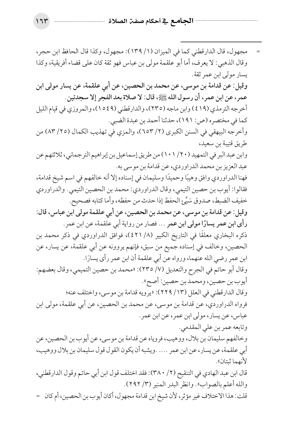 وقيل: عن قدامة بن موسى، عن محمد بن الحصين، عن أبي علقمة، عن يسار مولى ابن عمر، عن ابن عمر، أن رسول الله صلى الله عليه وسلم، قال: لا صلاة بعد الفجر إلا سجدتين.