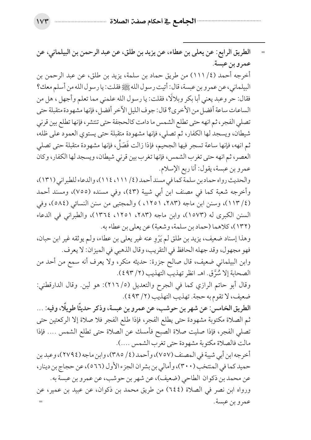 الطريق الخامس: عن شهر بن حوشب، عن عمرو بن عبسة، وذكر حديثًا طويلًا، وفيه: ... ثم الصلاة مكتوبة مشهودة حتى يطلع الفجر، فإذا طلع الفجر فلا صلاة إلا الركعتين حتى تصلي الفجر، فإذا صليت صلاة الصبح فأمسك عن الصلاة حتى تطلع الشمس .... فإذا مالت فالصلاة مكتوبة مشهودة حتى تغرب الشمس .... ).