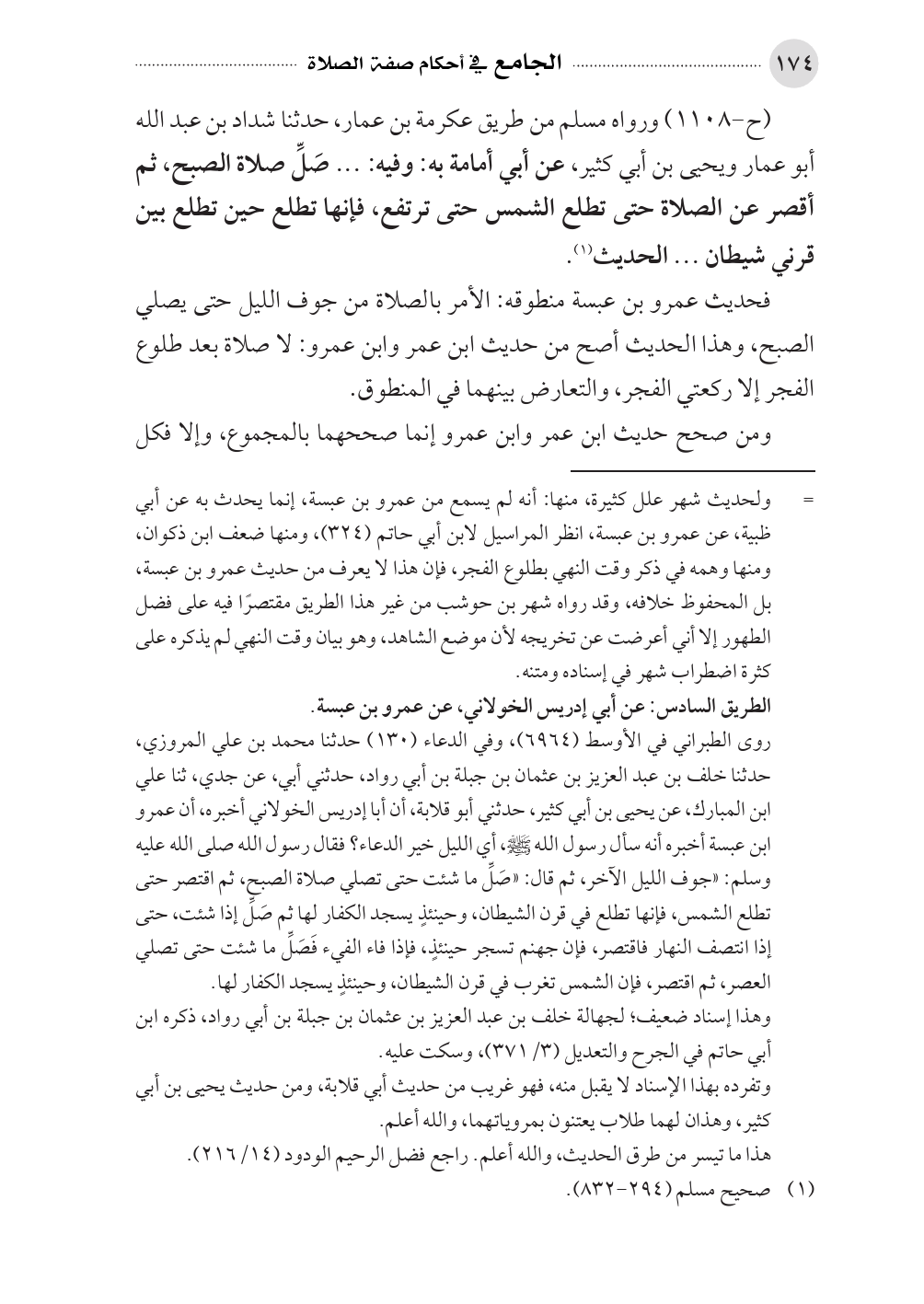 (ح-١١٠٨) ورواه مسلم من طريق عكرمة بن عمار، حدثنا شداد بن عبد الله أبو عمار ويحيى بن أبي كثير، عن أبي أمامة به: وفيه: ... صَلِّ صلاة الصبح، ثم أقصر عن الصلاة حتى تطلع الشمس حتى ترتفع، فإنها تطلع حين تطلع بين قرني شيطان ... الحديث (¬١).