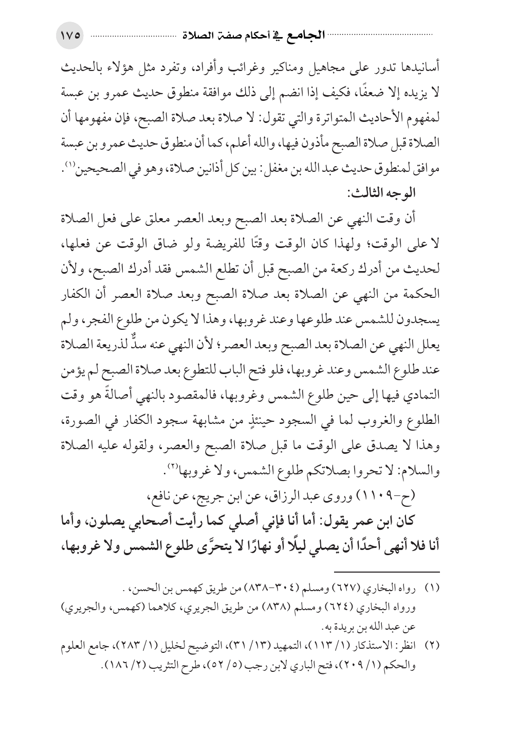 أن وقت النهي عن الصلاة بعد الصبح وبعد العصر معلق على فعل الصلاة لا على الوقت؛ ولهذا كان الوقت وقتًا للفريضة ولو ضاق الوقت عن فعلها، لحديث من أدرك ركعة من الصبح قبل أن تطلع الشمس فقد أدرك الصبح، ولأن الحكمة من النهي عن الصلاة بعد صلاة الصبح وبعد صلاة العصر أن الكفار يسجدون للشمس عند طلوعها وعند غروبها، وهذا لا يكون من طلوع الفجر، ولم يعلل النهي عن الصلاة بعد الصبح وبعد العصر؛ لأن النهي عنه سدٌّ لذريعة الصلاة عند طلوع الشمس وعند غروبها، فلو فتح الباب للتطوع بعد صلاة الصبح لم يؤمن التمادي فيها إلى حين طلوع الشمس وغروبها، فالمقصود بالنهي أصالةً هو وقت الطلوع والغروب لما في السجود حينئذٍ من مشابهة سجود الكفار في الصورة، وهذا لا يصدق على الوقت ما قبل صلاة الصبح والعصر، ولقوله عليه الصلاة والسلام: لا تحروا بصلاتكم طلوع الشمس، ولا غروبها (¬٢).