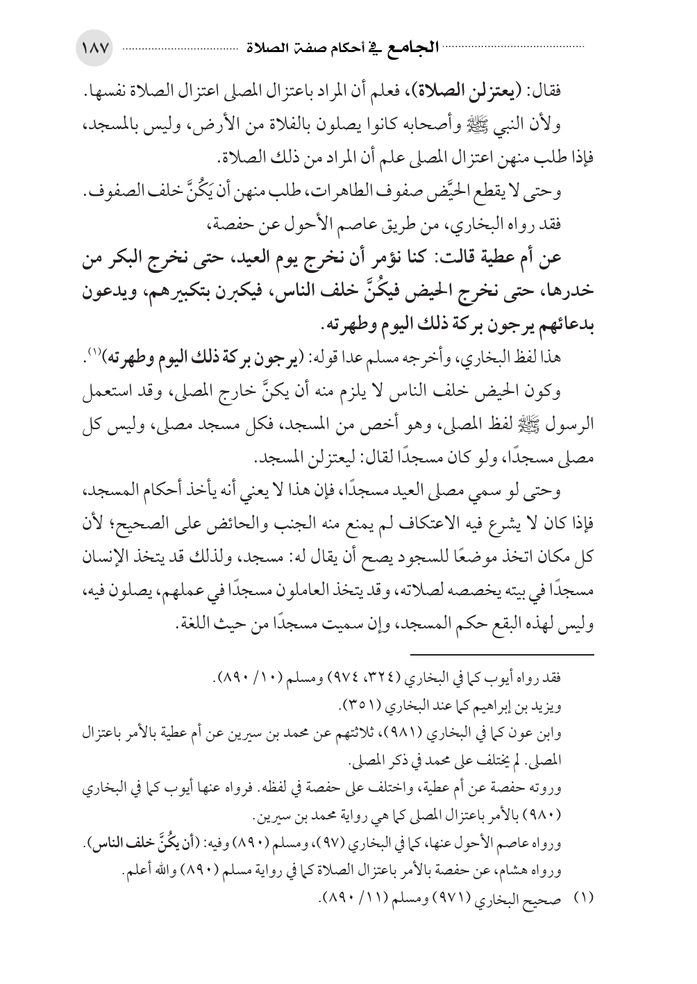 وكون الحيض خلف الناس لا يلزم منه أن يكنَّ خارج المصلى، وقد استعمل الرسول صلى الله عليه وسلم لفظ المصلى، وهو أخص من المسجد، فكل مسجد مصلى، وليس كل مصلى مسجدًا، ولو كان مسجدًا لقال: ليعتزلن المسجد.