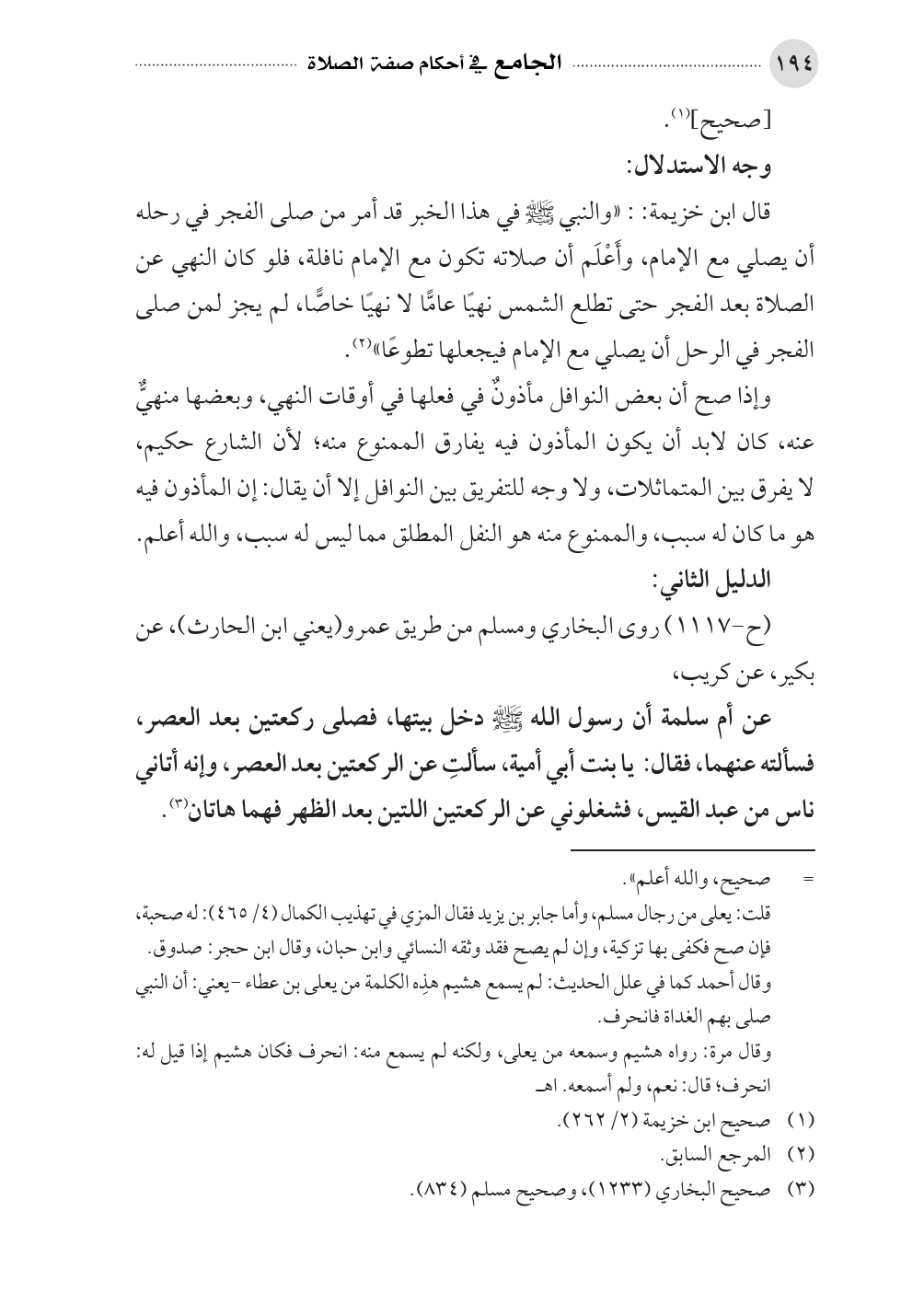 قال ابن خزيمة: «والنبي صلى الله عليه وسلم في هذا الخبر قد أمر من صلى الفجر في رحله أن يصلي مع الإمام، وأَعْلَم أن صلاته تكون مع الإمام نافلة، فلو كان النهي عن الصلاة بعد الفجر حتى تطلع الشمس نهيًا عامًّا لا نهيًا خاصًّا، لم يجز لمن صلى الفجر في الرحل أن يصلي مع الإمام فيجعلها تطوعًا» (¬٢).