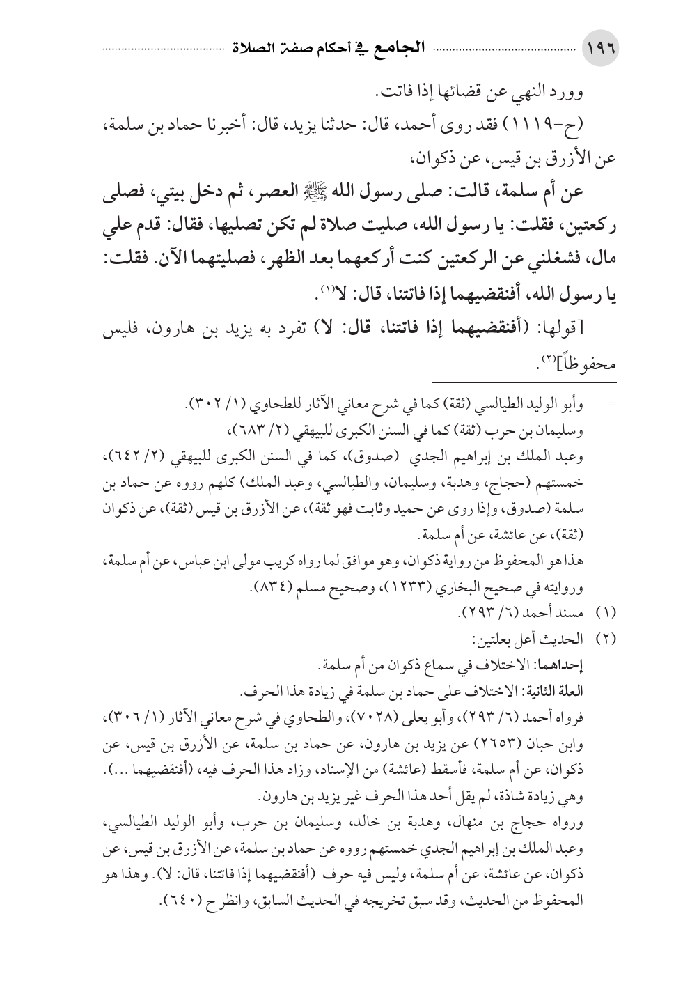 ورواه حجاج بن منهال، وهدبة بن خالد، وسليمان بن حرب، وأبو الوليد الطيالسي، وعبد الملك بن إبراهيم الجدي خمستهم رووه عن حماد بن سلمة، عن الأزرق بن قيس، عن ذكوان، عن عائشة، عن أم سلمة، وليس فيه حرف (أفنقضيهما إذا فاتتنا، قال: لا). وهذا هو المحفوظ من الحديث، وقد سبق تخريجه في الحديث السابق، وانظر ح (٦٤٠).