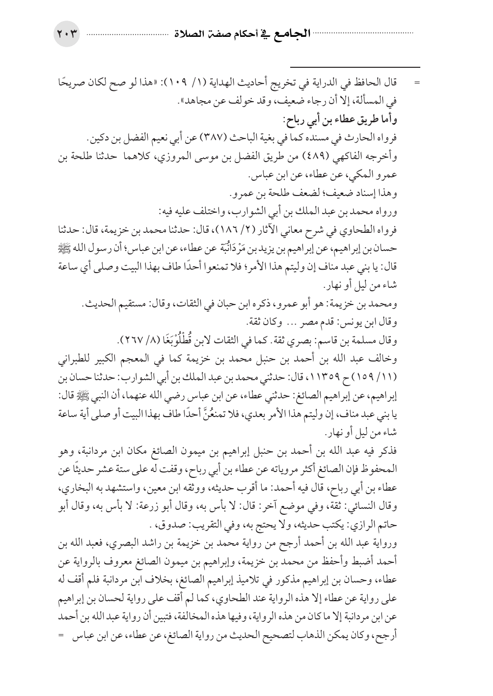 ورواية عبد الله بن أحمد أرجح من رواية محمد بن خزيمة بن راشد البصري، فعبد الله بن أحمد أضبط وأحفظ من محمد بن خزيمة، وإبراهيم بن ميمون الصائغ معروف بالرواية عن عطاء، وحسان بن إبراهيم مذكور في تلاميذ إبراهيم الصائغ، بخلاف ابن مردانبة فلم أقف له على رواية عن عطاء إلا هذه الرواية عند الطحاوي، كما لم أقف على رواية لحسان بن إبراهيم عن ابن مردانبة إلا ما كان من هذه الرواية، وفيها هذه المخالفة، فتبين أن رواية عبد الله بن أحمد أرجح، وكان يمكن الذهاب لتصحيح الحديث من رواية الصائغ، عن عطاء، عن ابن عباس =