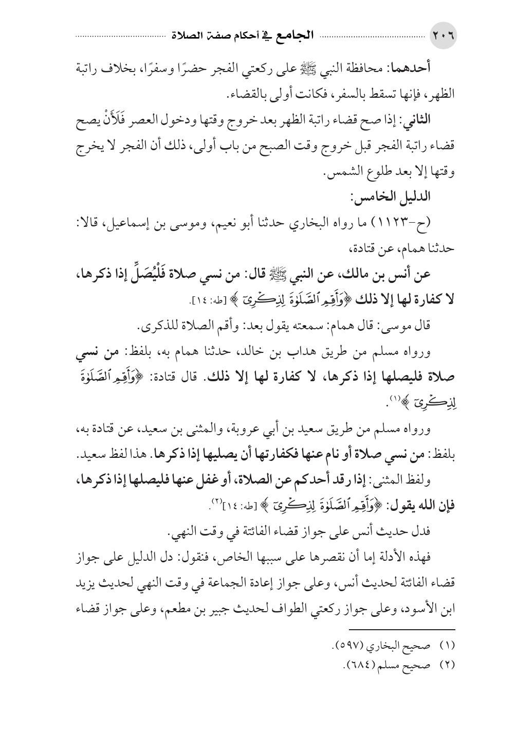 عن أنس بن مالك، عن النبي صلى الله عليه وسلم قال: من نسي صلاة فَلْيُصَلِّ إذا ذكرها، لا كفارة لها إلا ذلك {وَأَقِمِ الصَّلَاةَ لِذِكْرِي} [طه: ١٤].