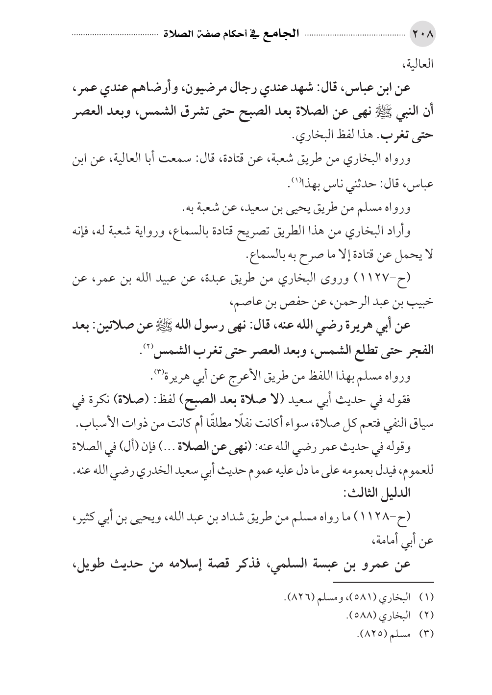 عن ابن عباس، قال: شهد عندي رجال مرضيون، وأرضاهم عندي عمر، أن النبي صلى الله عليه وسلم نهى عن الصلاة بعد الصبح حتى تشرق الشمس، وبعد العصر حتى تغرب. هذا لفظ البخاري.