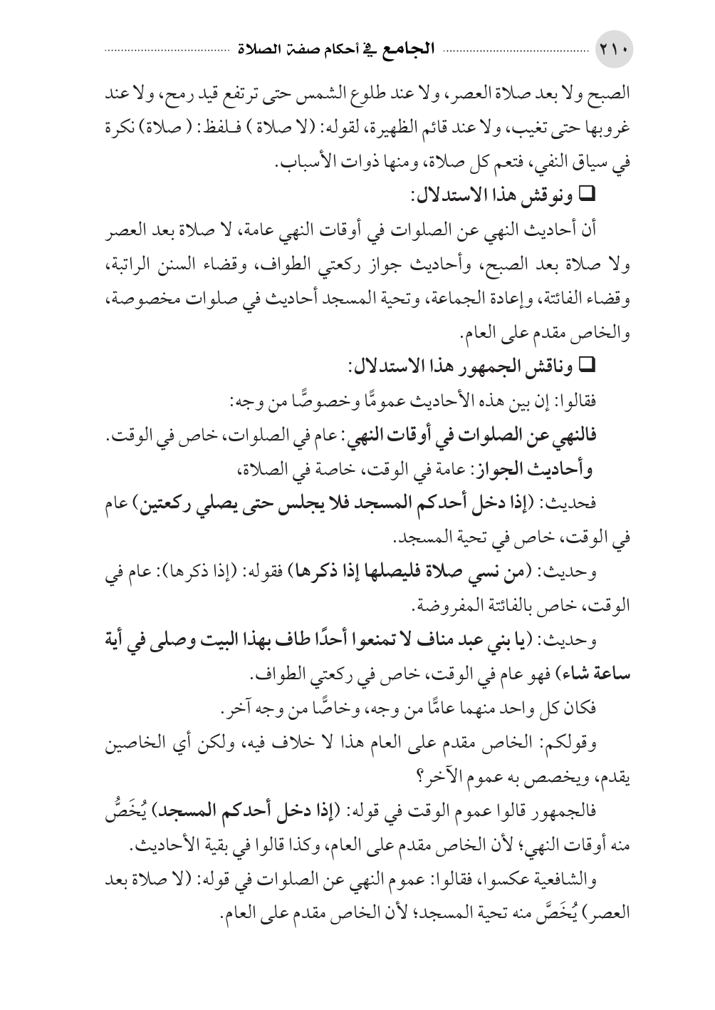 وحديث: (يا بني عبد مناف لا تمنعوا أحدًا طاف بهذا البيت وصلى في أية ساعة شاء) فهو عام في الوقت، خاص في ركعتي الطواف.