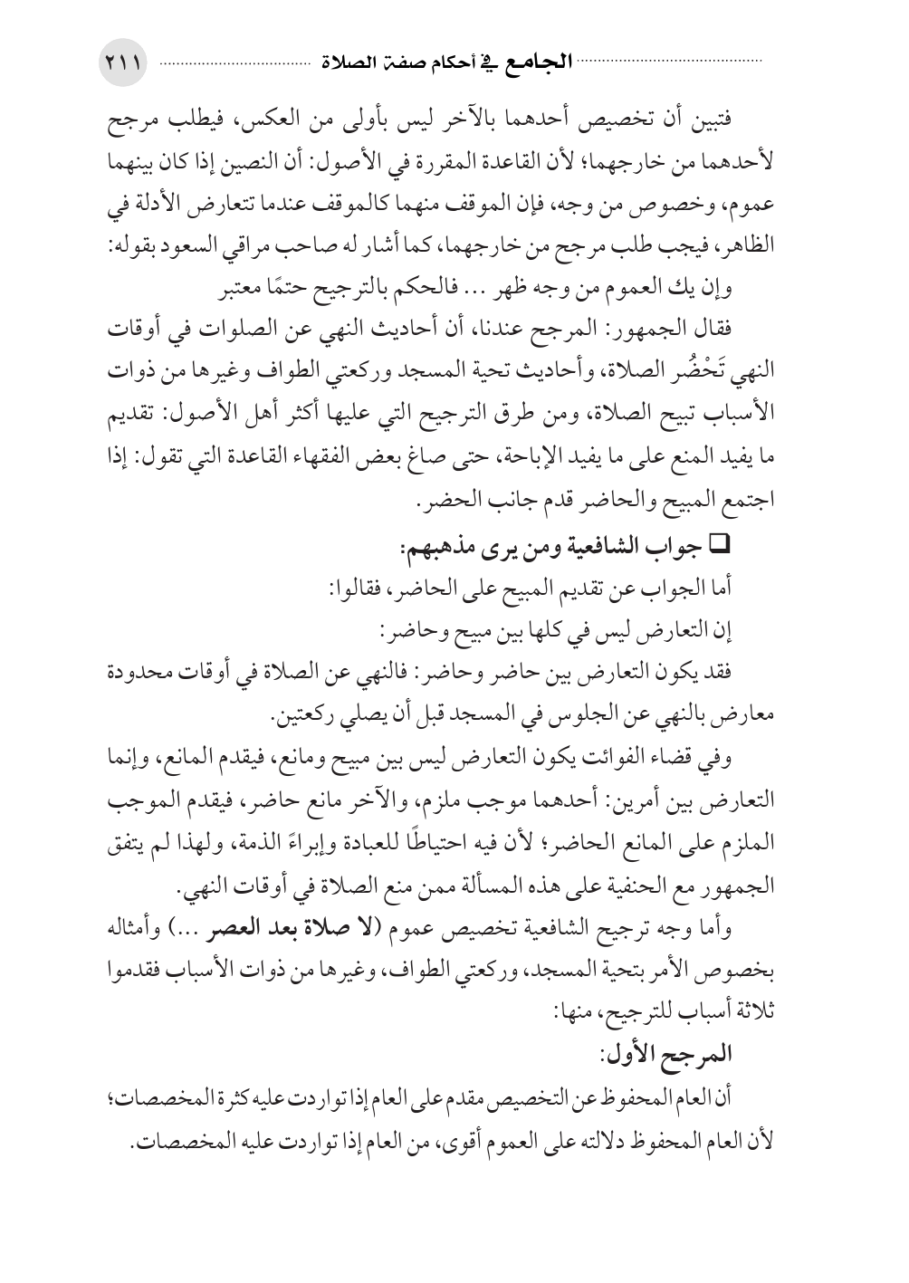 وأما وجه ترجيح الشافعية تخصيص عموم (لا صلاة بعد العصر ... ) وأمثاله بخصوص الأمر بتحية المسجد، وركعتي الطواف، وغيرها من ذوات الأسباب فقدموا ثلاثة أسباب للترجيح، منها: