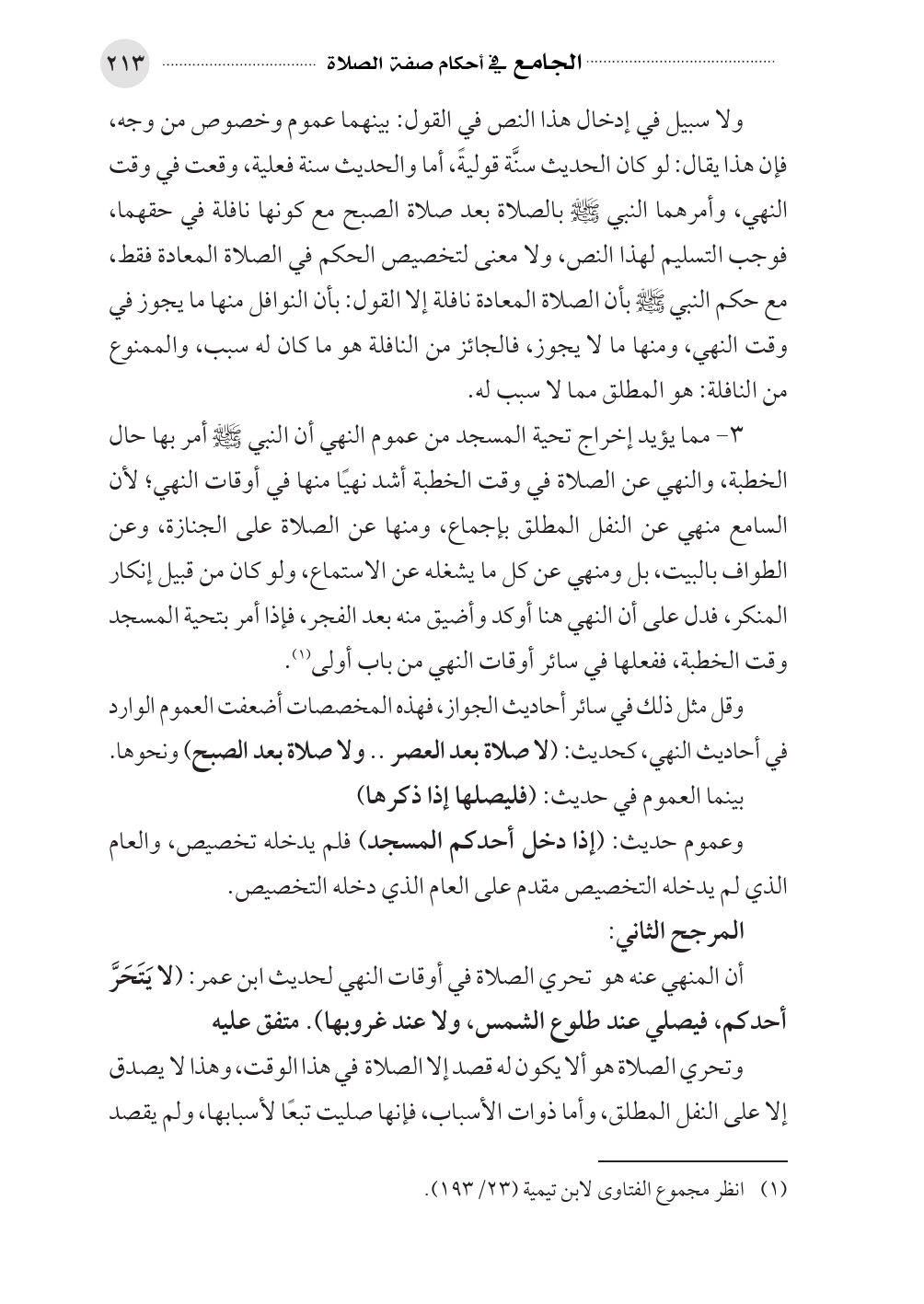 ولا سبيل في إدخال هذا النص في القول: بينهما عموم وخصوص من وجه، فإن هذا يقال: لو كان الحديث سنَّة قوليةً، أما والحديث سنة فعلية، وقعت في وقت النهي، وأمرهما النبي صلى الله عليه وسلم بالصلاة بعد صلاة الصبح مع كونها نافلة في حقهما، فوجب التسليم لهذا النص، ولا معنى لتخصيص الحكم في الصلاة المعادة فقط، مع حكم النبي صلى الله عليه وسلم بأن الصلاة المعادة نافلة إلا القول: بأن النوافل منها ما يجوز في وقت النهي، ومنها ما لا يجوز، فالجائز من النافلة هو ما كان له سبب، والممنوع من النافلة: هو المطلق مما لا سبب له.