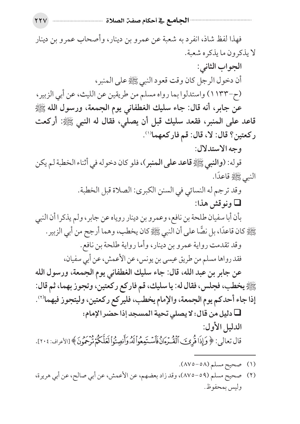 بأن أبا سفيان طلحة بن نافع، وعمرو بن دينار روياه عن جابر، ولم يذكرا أن النبي صلى الله عليه وسلم كان قاعدًا، بل نصًّا على أن النبي صلى الله عليه وسلم كان يخطب، وهما أرجح من أبي الزبير.