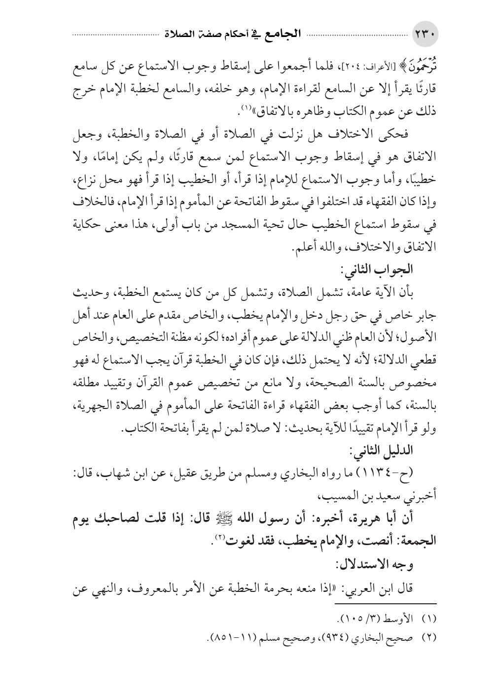 تُرْحَمُونَ} [الأعراف: ٢٠٤]، فلما أجمعوا على إسقاط وجوب الاستماع عن كل سامع قارئًا يقرأ إلا عن السامع لقراءة الإمام، وهو خلفه، والسامع لخطبة الإمام خرج ذلك عن عموم الكتاب وظاهره بالاتفاق» (¬١).