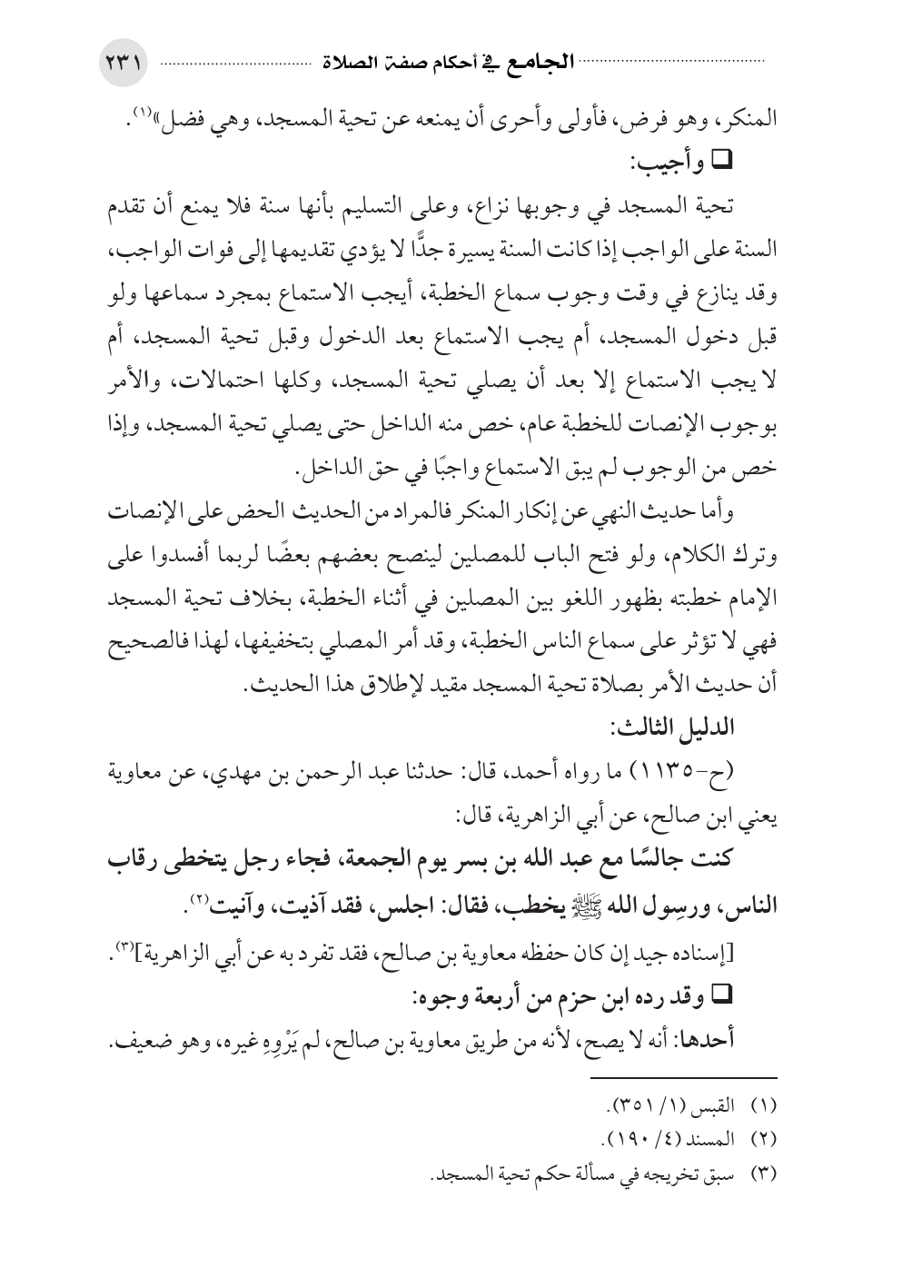 وأما حديث النهي عن إنكار المنكر فالمراد من الحديث الحض على الإنصات وترك الكلام، ولو فتح الباب للمصلين لينصح بعضهم بعضًا لربما أفسدوا على الإمام خطبته بظهور اللغو بين المصلين في أثناء الخطبة، بخلاف تحية المسجد فهي لا تؤثر على سماع الناس الخطبة، وقد أمر المصلي بتخفيفها، لهذا فالصحيح أن حديث الأمر بصلاة تحية المسجد مقيد لإطلاق هذا الحديث.