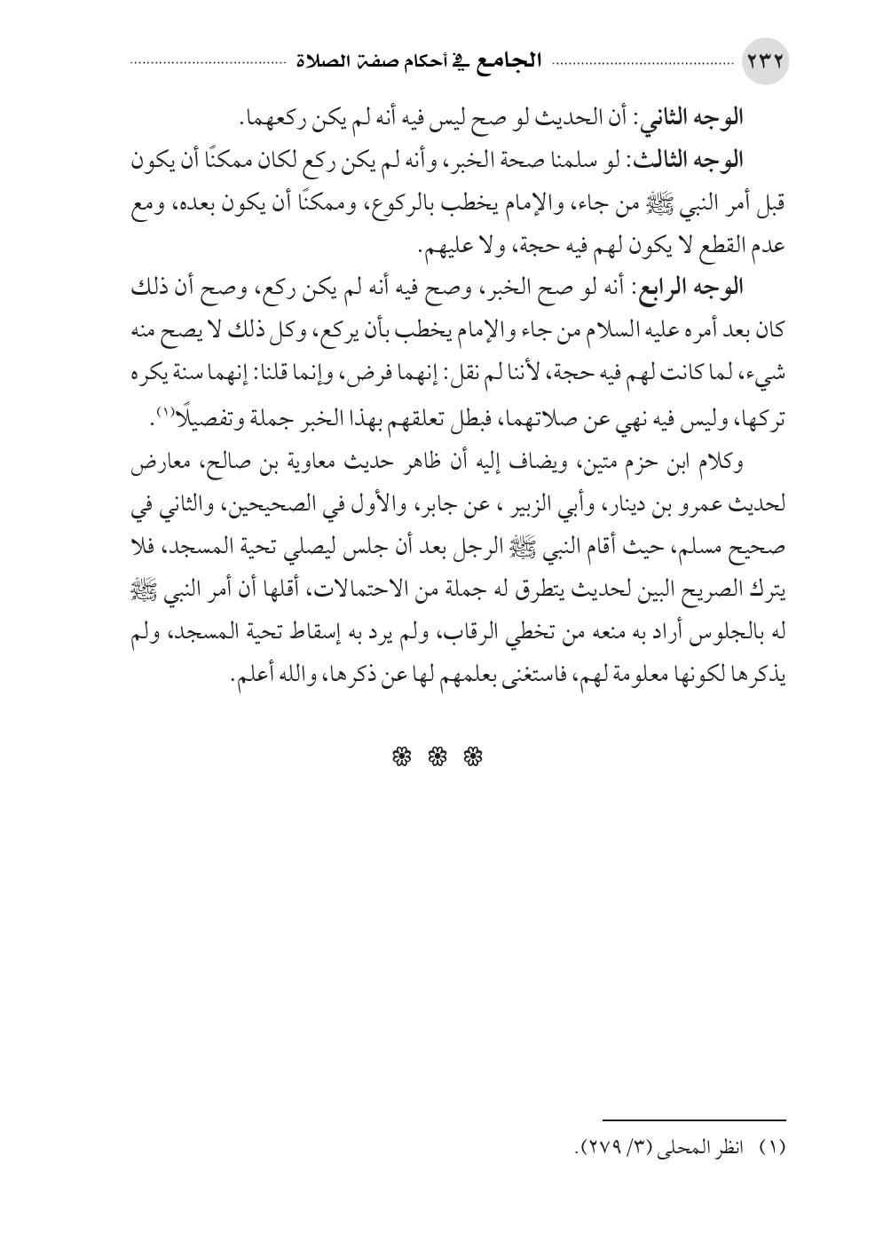 وكلام ابن حزم متين، ويضاف إليه أن ظاهر حديث معاوية بن صالح، معارض لحديث عمرو بن دينار، وأبي الزبير، عن جابر، والأول في الصحيحين، والثاني في صحيح مسلم، حيث أقام النبي صلى الله عليه وسلم الرجل بعد أن جلس ليصلي تحية المسجد، فلا يترك الصريح البين لحديث يتطرق له جملة من الاحتمالات، أقلها أن أمر النبي صلى الله عليه وسلم له بالجلوس أراد به منعه من تخطي الرقاب، ولم يرد به إسقاط تحية المسجد، ولم يذكرها لكونها معلومة لهم، فاستغنى بعلمهم لها عن ذكرها، والله أعلم.