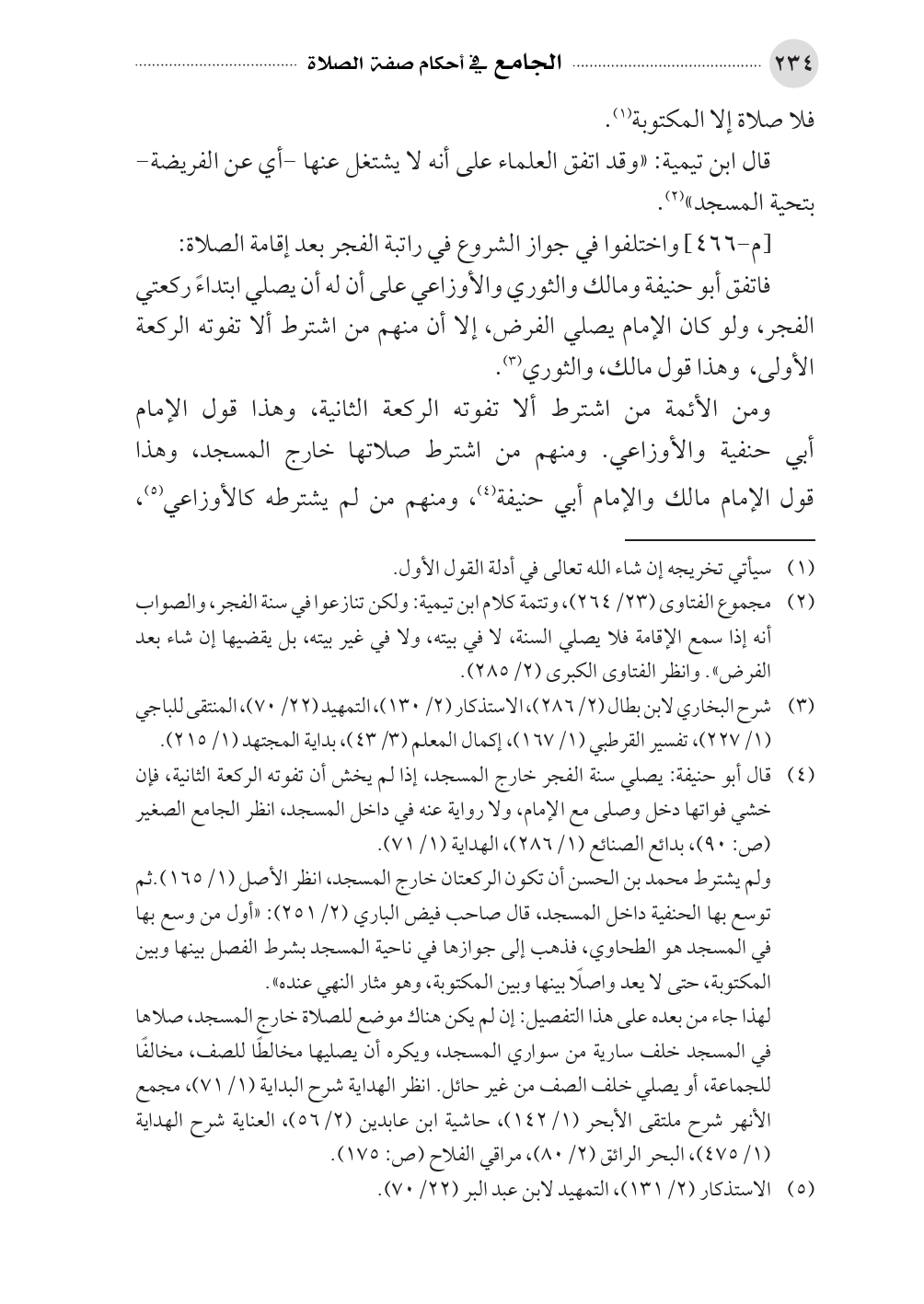 (¬٢). مجموع الفتاوى (٢٣/ ٢٦٤)، وتتمة كلام ابن تيمية: ولكن تنازعوا في سنة الفجر، والصواب أنه إذا سمع الإقامة فلا يصلي السنة، لا في بيته، ولا في غير بيته، بل يقضيها إن شاء بعد الفرض». وانظر الفتاوى الكبرى (٢/ ٢٨٥).