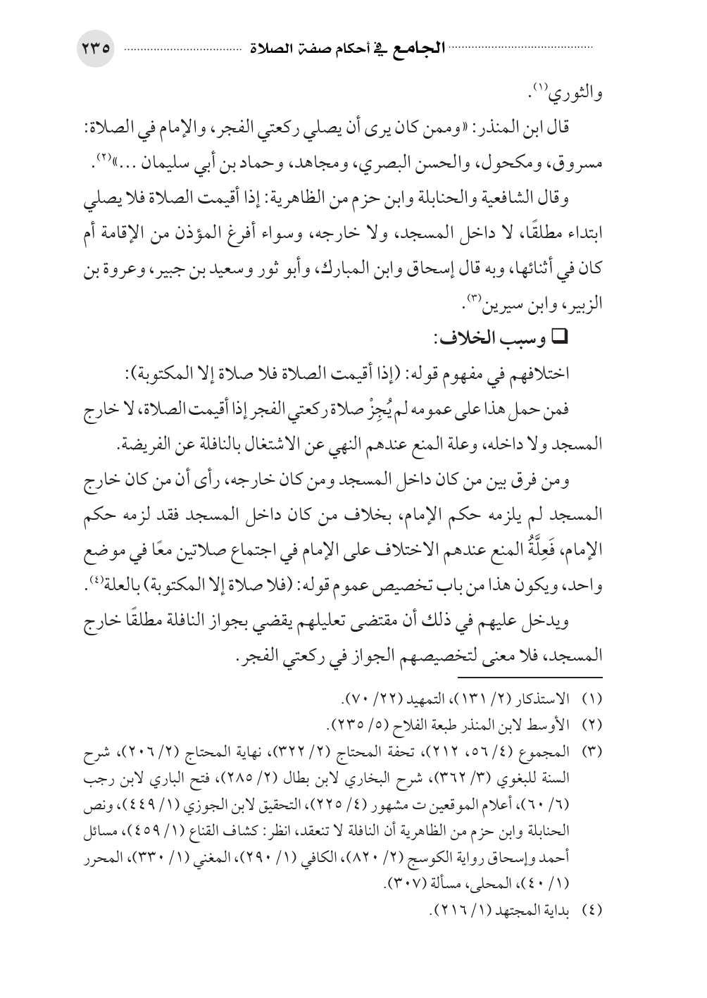 (¬٣). المجموع (٤/ ٥٦، ٢١٢)، تحفة المحتاج (٢/ ٣٢٢)، نهاية المحتاج (٢/ ٢٠٦)، شرح السنة للبغوي (٣/ ٣٦٢)، شرح البخاري لابن بطال (٢/ ٢٨٥)، فتح الباري لابن رجب (٦/ ٦٠)، أعلام الموقعين ت مشهور (٤/ ٢٢٥)، التحقيق لابن الجوزي (١/ ٤٤٩)، ونص الحنابلة وابن حزم من الظاهرية أن النافلة لا تنعقد، انظر: كشاف القناع (١/ ٤٥٩)، مسائل أحمد وإسحاق رواية الكوسج (٢/ ٨٢٠)، الكافي (١/ ٢٩٠)، المغني (١/ ٣٣٠)، المحرر (١/ ٤٠)، المحلى، مسألة (٣٠٧).