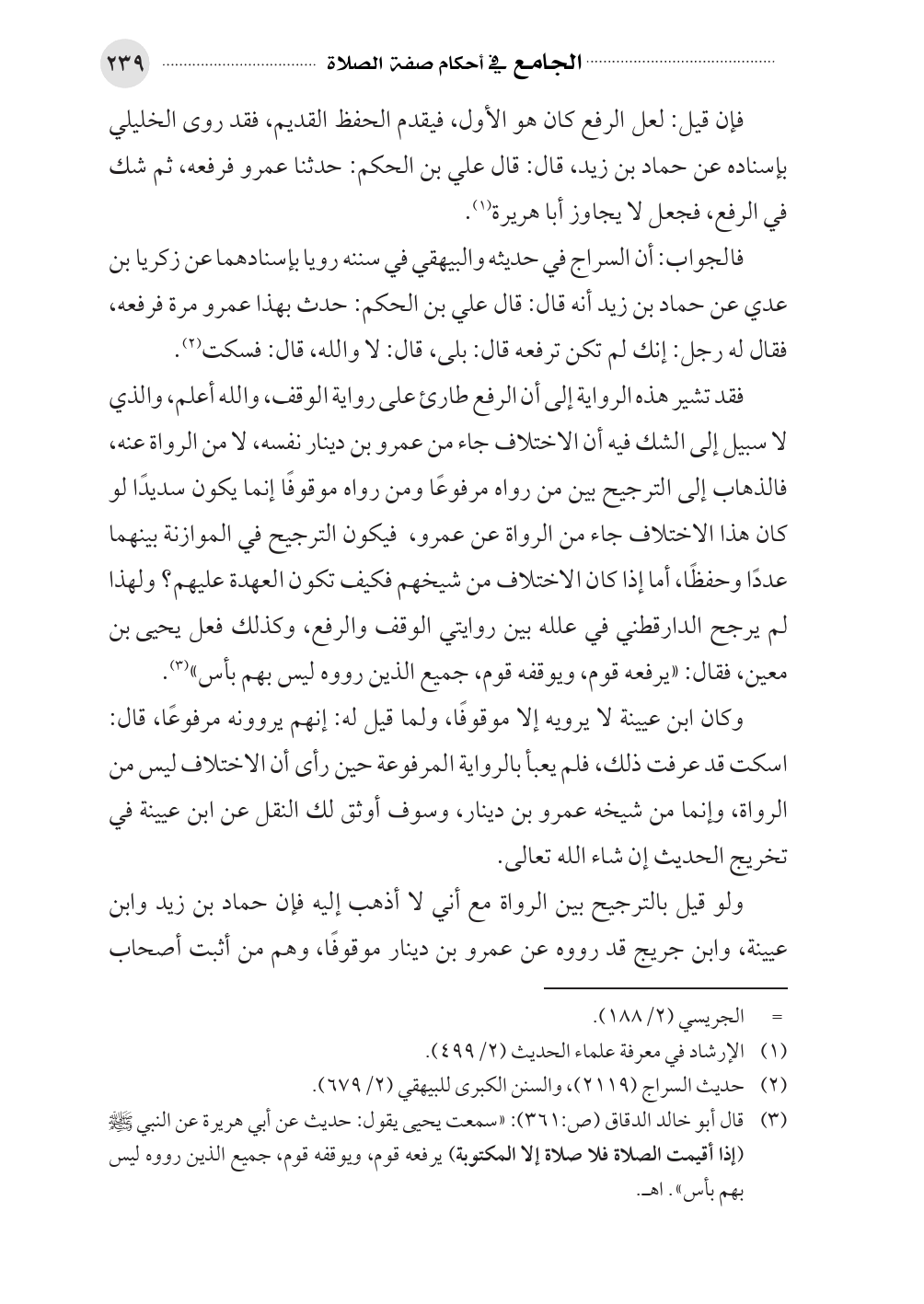 فالجواب: أن السراج في حديثه والبيهقي في سننه رويا بإسنادهما عن زكريا بن عدي عن حماد بن زيد أنه قال: قال علي بن الحكم: حدث بهذا عمرو مرة فرفعه، فقال له رجل: إنك لم تكن ترفعه قال: بلى، قال: لا والله، قال: فسكت (¬٢).