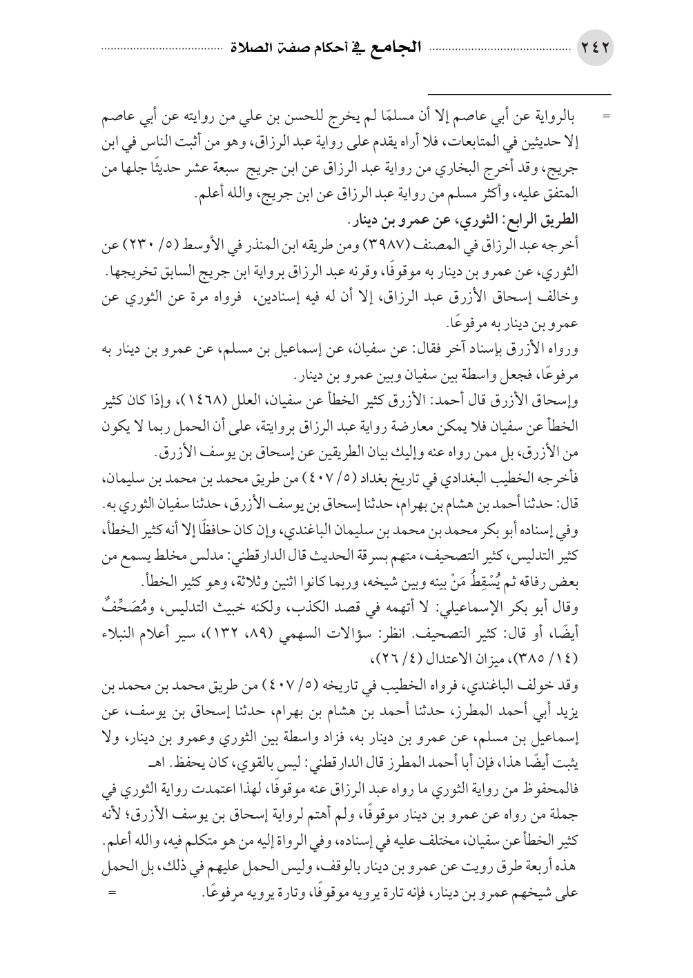 فالمحفوظ من رواية الثوري ما رواه عبد الرزاق عنه موقوفًا، لهذا اعتمدت رواية الثوري في جملة من رواه عن عمرو بن دينار موقوفًا، ولم أهتم لرواية إسحاق بن يوسف الأزرق؛ لأنه كثير الخطأ عن سفيان، مختلف عليه في إسناده، وفي الرواة إليه من هو متكلم فيه، والله أعلم.