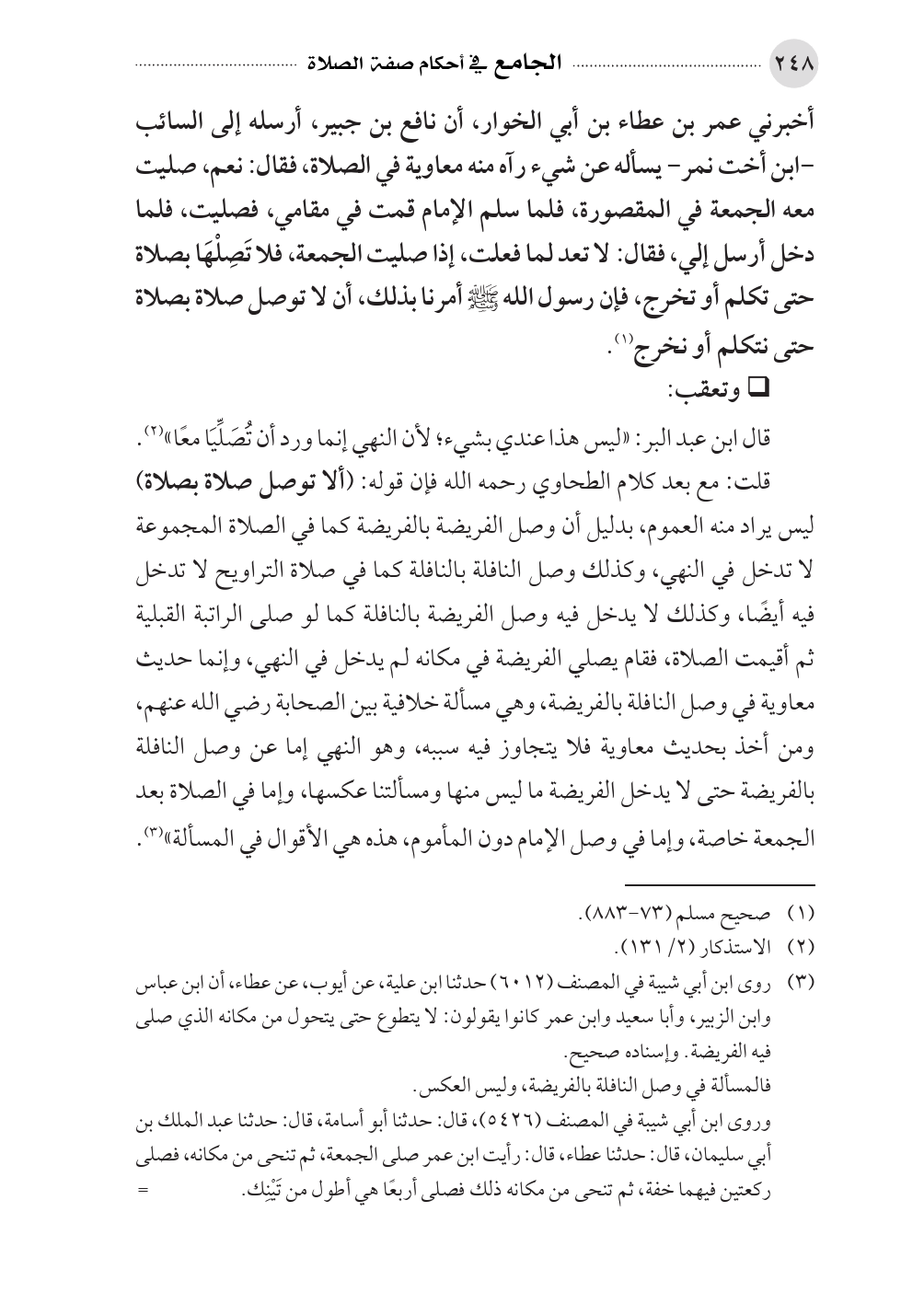 قلت: مع بعد كلام الطحاوي رحمه الله فإن قوله: (ألا توصل صلاة بصلاة) ليس يراد منه العموم، بدليل أن وصل الفريضة بالفريضة كما في الصلاة المجموعة لا تدخل في النهي، وكذلك وصل النافلة بالنافلة كما في صلاة التراويح لا تدخل فيه أيضًا، وكذلك لا يدخل فيه وصل الفريضة بالنافلة كما لو صلى الراتبة القبلية ثم أقيمت الصلاة، فقام يصلي الفريضة في مكانه لم يدخل في النهي، وإنما حديث معاوية في وصل النافلة بالفريضة، وهي مسألة خلافية بين الصحابة رضي الله عنهم، ومن أخذ بحديث معاوية فلا يتجاوز فيه سببه، وهو النهي إما عن وصل النافلة بالفريضة حتى لا يدخل الفريضة ما ليس منها ومسألتنا عكسها، وإما في الصلاة بعد الجمعة خاصة، وإما في وصل الإمام دون المأموم، هذه هي الأقوال في المسألة» (¬٣).