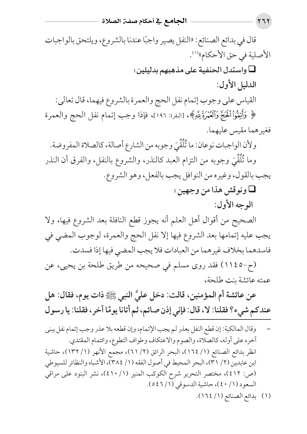 قال في بدائع الصنائع: «النفل يصير واجبًا عندنا بالشروع، ويلتحق بالواجبات الأصلية في حق الأحكام» (¬١).