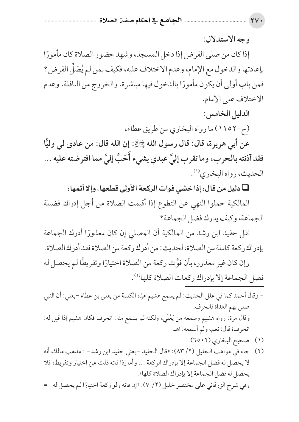 (¬٢). جاء في مواهب الجليل (٢/ ٨٣): «قال الحفيد -يعني حفيد ابن رشد-: مذهب مالك أنه لا يحصل له فضل الجماعة إلا بإدراك الركعة ... وأما إذا فاته ذلك عن اختيار وتفريط، فلا يحصل له فضل الجماعة إلا بإدراك الصلاة كلها».