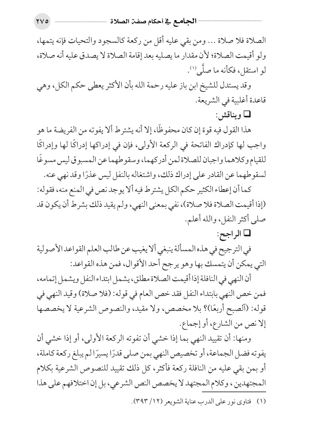كما أن إعطاء الكثير حكم الكل يشترط فيه ألا يوجد نص في المنع منه، فقوله: (إذا أقيمت الصلاة فلا صلاة)، نفي بمعنى النهي، ولم يقيد ذلك بشرط أن يكون قد صلى أكثر النفل، والله أعلم.
