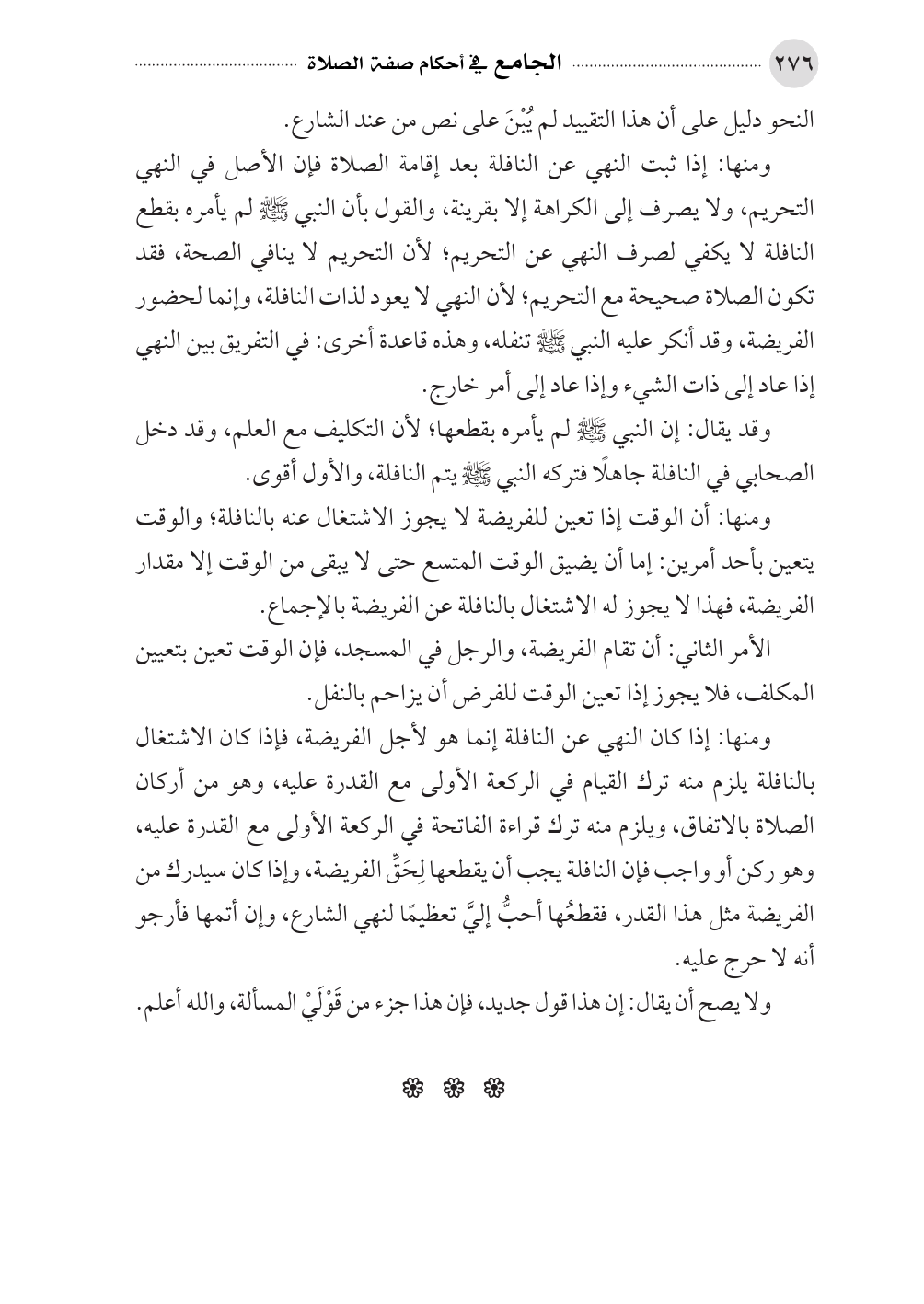 ومنها: إذا ثبت النهي عن النافلة بعد إقامة الصلاة فإن الأصل في النهي التحريم، ولا يصرف إلى الكراهة إلا بقرينة، والقول بأن النبي صلى الله عليه وسلم لم يأمره بقطع النافلة لا يكفي لصرف النهي عن التحريم؛ لأن التحريم لا ينافي الصحة، فقد تكون الصلاة صحيحة مع التحريم؛ لأن النهي لا يعود لذات النافلة، وإنما لحضور الفريضة، وقد أنكر عليه النبي صلى الله عليه وسلم تنفله، وهذه قاعدة أخرى: في التفريق بين النهي إذا عاد إلى ذات الشيء وإذا عاد إلى أمر خارج.