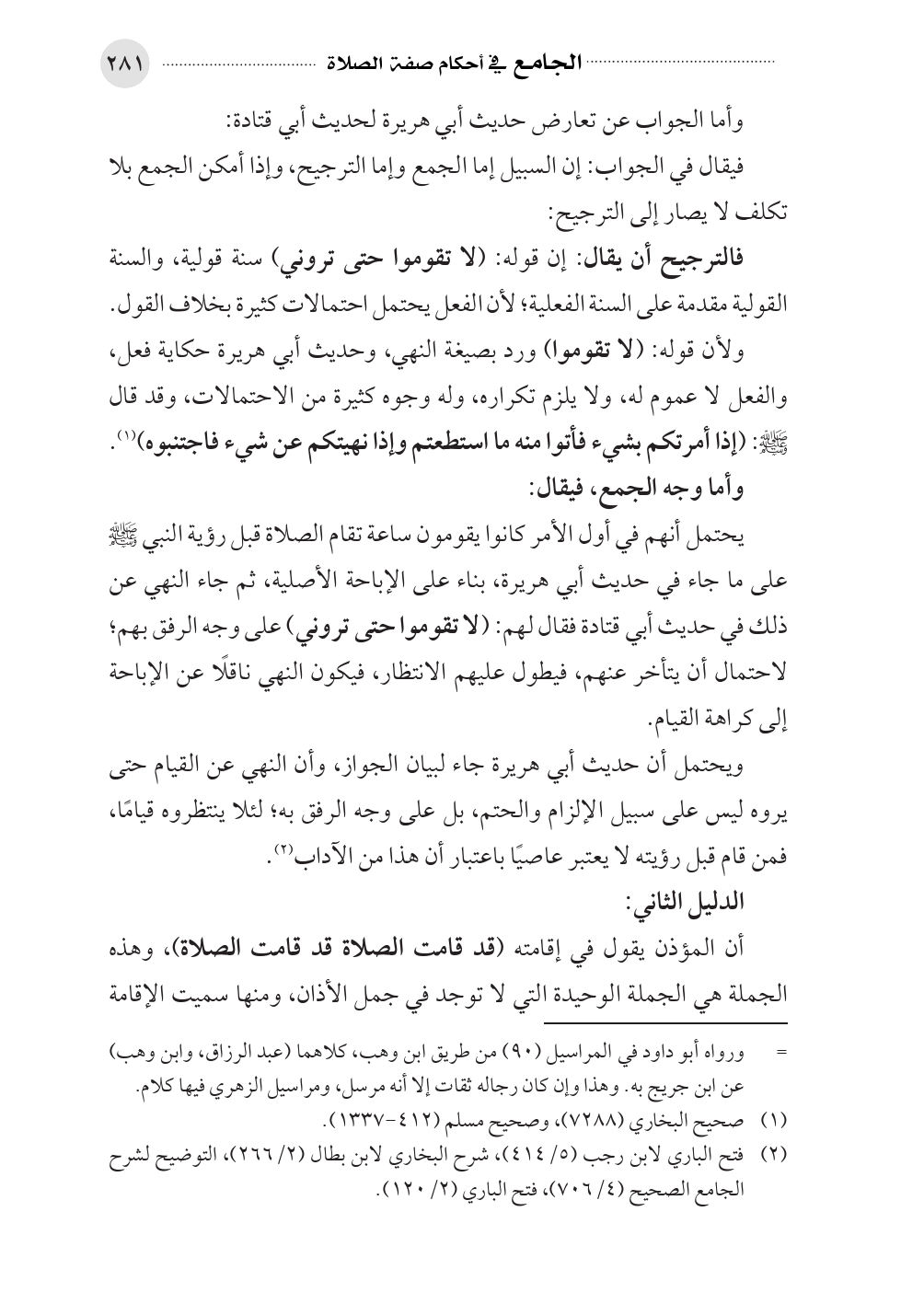 فالترجيح أن يقال: إن قوله: (لا تقوموا حتى تروني) سنة قولية، والسنة القولية مقدمة على السنة الفعلية؛ لأن الفعل يحتمل احتمالات كثيرة بخلاف القول.