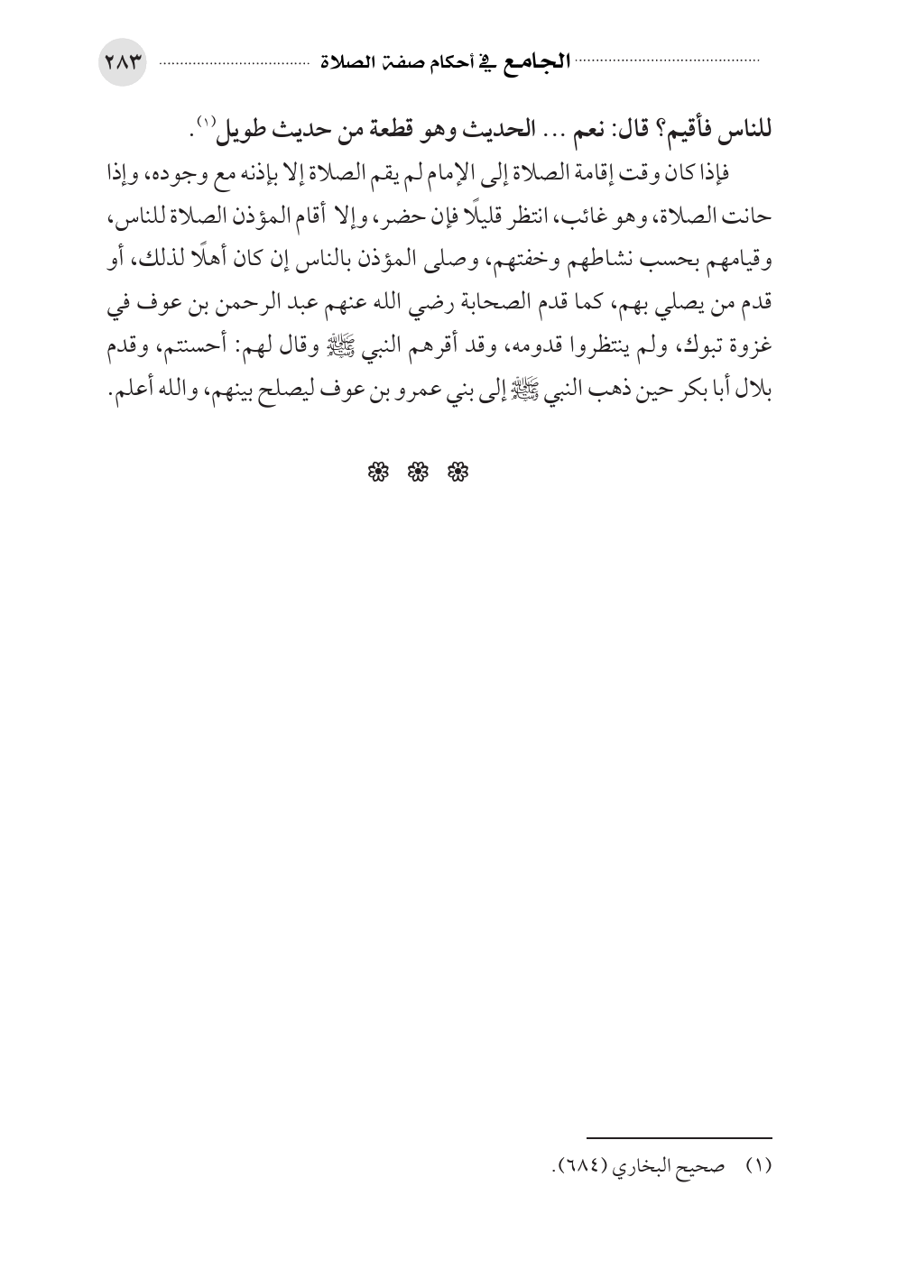 فإذا كان وقت إقامة الصلاة إلى الإمام لم يقم الصلاة إلا بإذنه مع وجوده، وإذا حانت الصلاة، وهو غائب، انتظر قليلًا فإن حضر، وإلا أقام المؤذن الصلاة للناس، وقيامهم بحسب نشاطهم وخفتهم، وصلى المؤذن بالناس إن كان أهلًا لذلك، أو قدم من يصلي بهم، كما قدم الصحابة رضي الله عنهم عبد الرحمن بن عوف في غزوة تبوك، ولم ينتظروا قدومه، وقد أقرهم النبي صلى الله عليه وسلم وقال لهم: أحسنتم، وقدم بلال أبا بكر حين ذهب النبي صلى الله عليه وسلم إلى بني عمرو بن عوف ليصلح بينهم، والله أعلم.