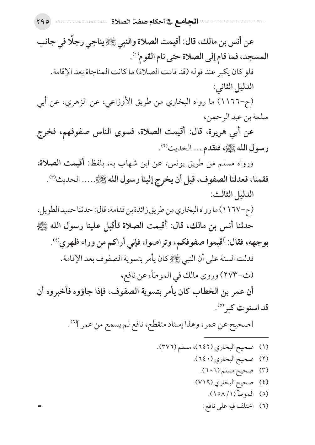 أن عمر بن الخطاب كان يأمر بتسوية الصفوف، فإذا جاؤوه فأخبروه أن قد استوت كبر (¬٥).
