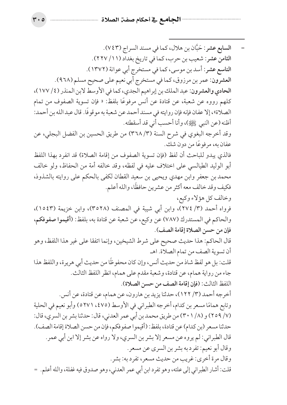 الحادي والعشرون: عبد الملك بن إبراهيم الجدي، كما في الأوسط لابن المنذر (٤/ ١٧٧)، كلهم رووه عن شعبة، عن قتادة عن أنس مرفوعًا بلفظ: «فإن تسوية الصفوف من تمام الصلاة»، إلا عفان فإنه فإن روايته في مسند أحمد عن شعبة به موقوفًا. قال عبد الله بن أحمد: أظنه (عن النبي صلى الله عليه وسلم)، وأنا أحسب أني قد أسقطته.