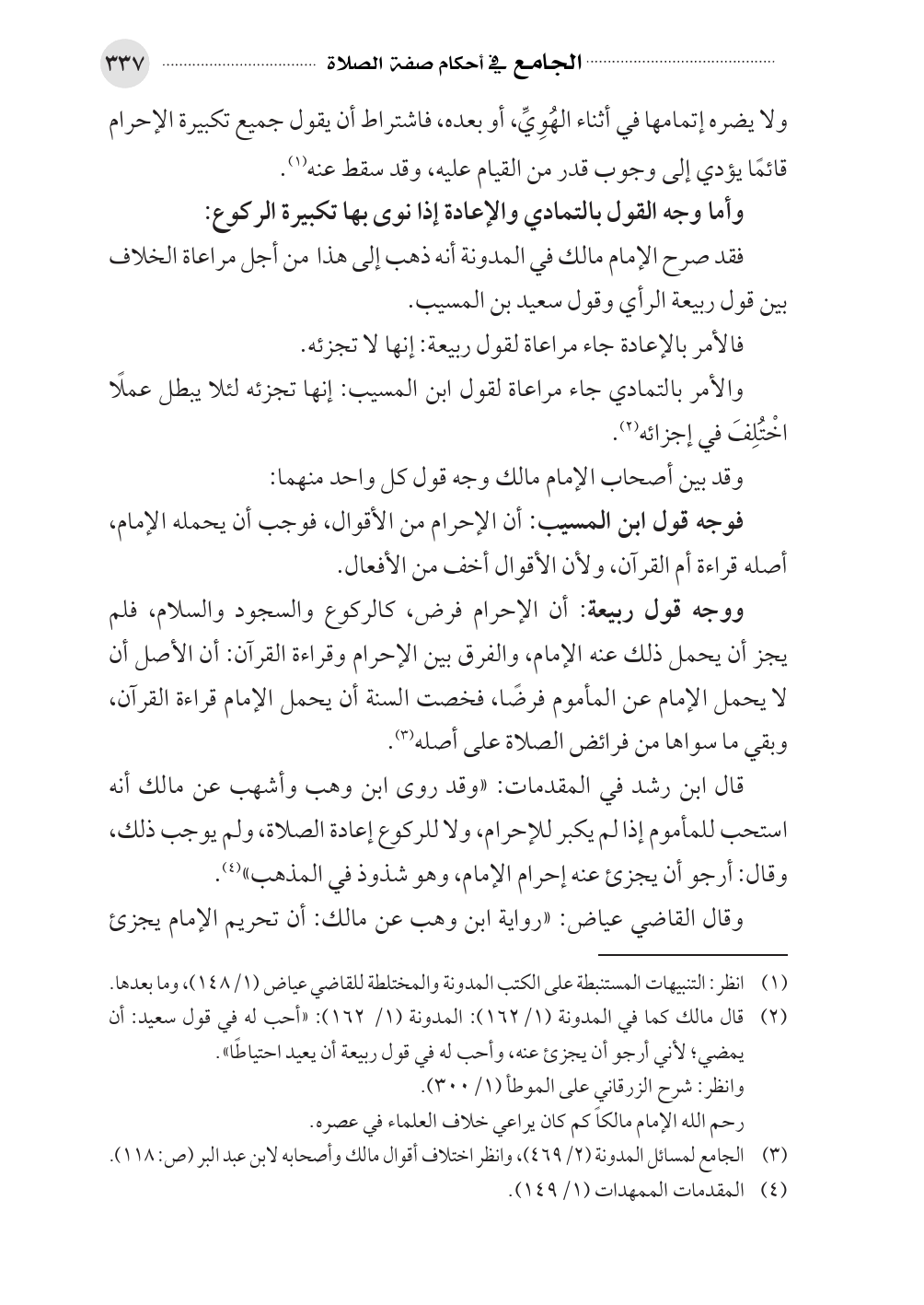 (¬٢). قال مالك كما في المدونة (١/ ١٦٢): المدونة (١/ ١٦٢): «أحب له في قول سعيد: أن يمضي؛ لأني أرجو أن يجزئ عنه، وأحب له في قول ربيعة أن يعيد احتياطًا».