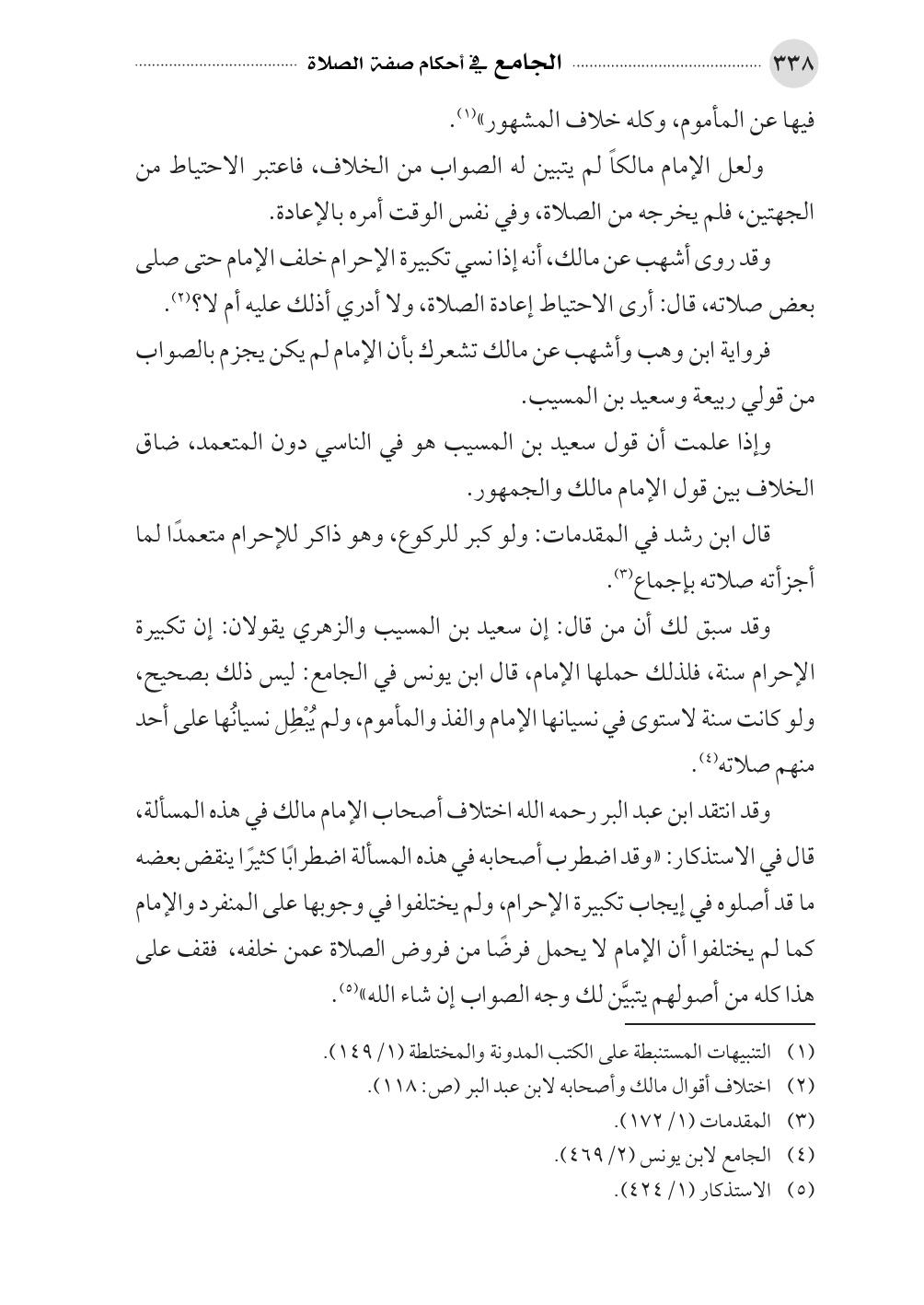 وقد انتقد ابن عبد البر رحمه الله اختلاف أصحاب الإمام مالك في هذه المسألة، قال في الاستذكار: «وقد اضطرب أصحابه في هذه المسألة اضطرابًا كثيرًا ينقض بعضه ما قد أصلوه في إيجاب تكبيرة الإحرام، ولم يختلفوا في وجوبها على المنفرد والإمام كما لم يختلفوا أن الإمام لا يحمل فرضًا من فروض الصلاة عمن خلفه، فقف على هذا كله من أصولهم يتبيَّن لك وجه الصواب إن شاء الله» (¬٥).