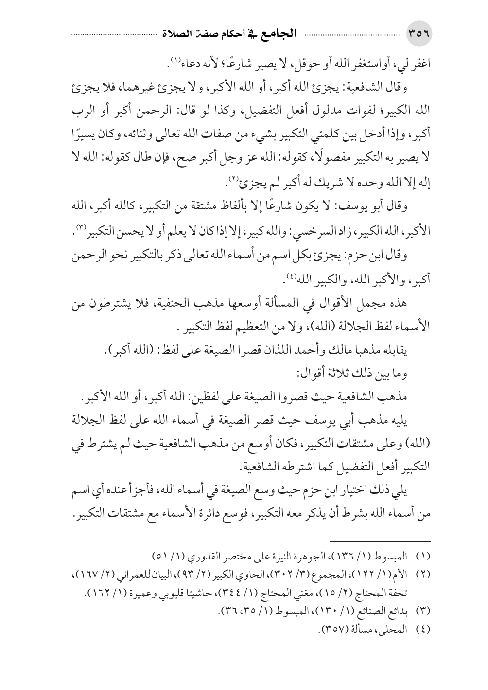 وقال أبو يوسف: لا يكون شارعًا إلا بألفاظ مشتقة من التكبير، كالله أكبر، الله الأكبر، الله الكبير، زاد السرخسي: والله كبير، إلا إذا كان لا يعلم أو لا يحسن التكبير (¬٣).