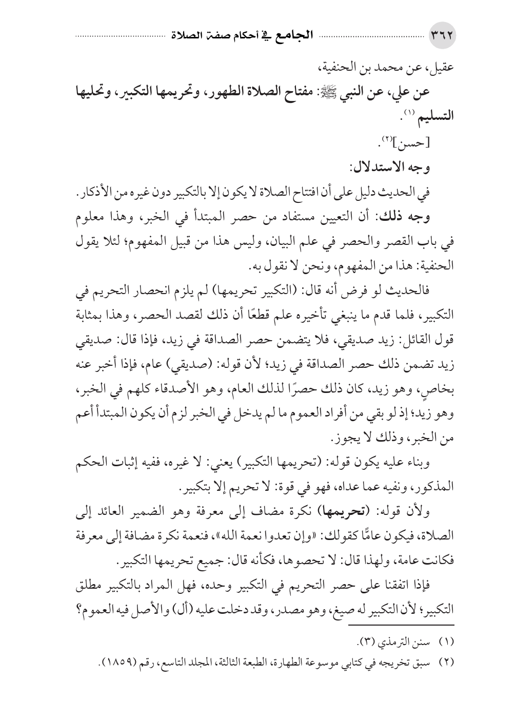 ولأن قوله: (تحريمها) نكرة مضاف إلى معرفة وهو الضمير العائد إلى الصلاة، فيكون عامًّا كقولك: «وإن تعدوا نعمة الله»، فنعمة نكرة مضافة إلى معرفة فكانت عامة، ولهذا قال: لا تحصوها، فكأنه قال: جميع تحريمها التكبير.