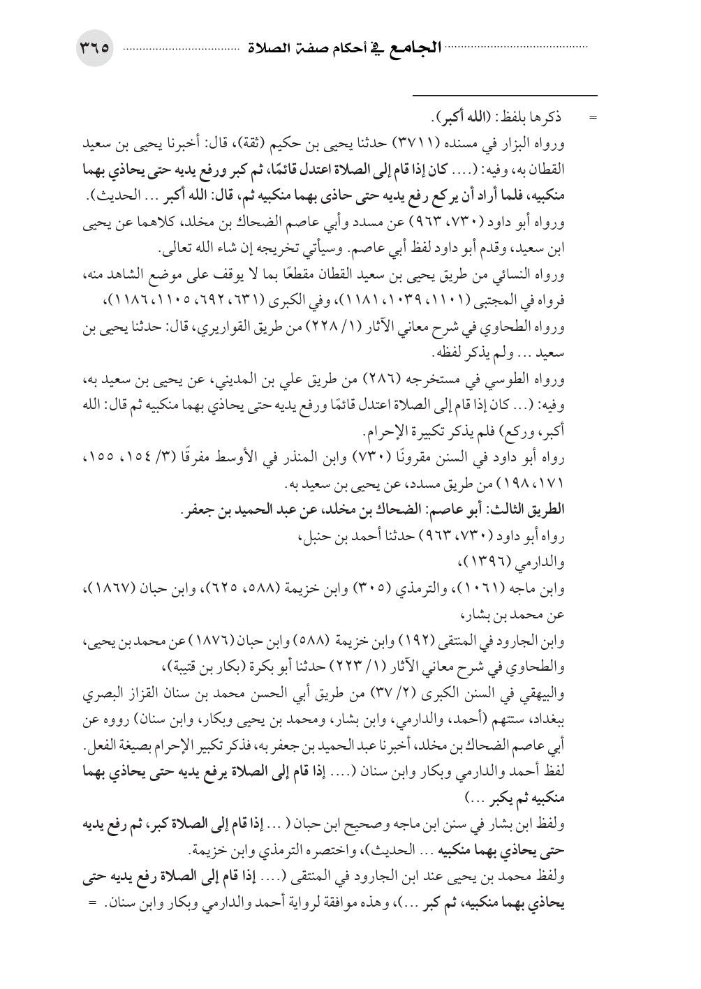 ورواه البزار في مسنده (٣٧١١) حدثنا يحيى بن حكيم (ثقة)، قال: أخبرنا يحيى بن سعيد القطان به، وفيه: ( .... كان إذا قام إلى الصلاة اعتدل قائمًا، ثم كبر ورفع يديه حتى يحاذي بهما منكبيه، فلما أراد أن يركع رفع يديه حتى حاذى بهما منكبيه ثم، قال: الله أكبر ... الحديث).