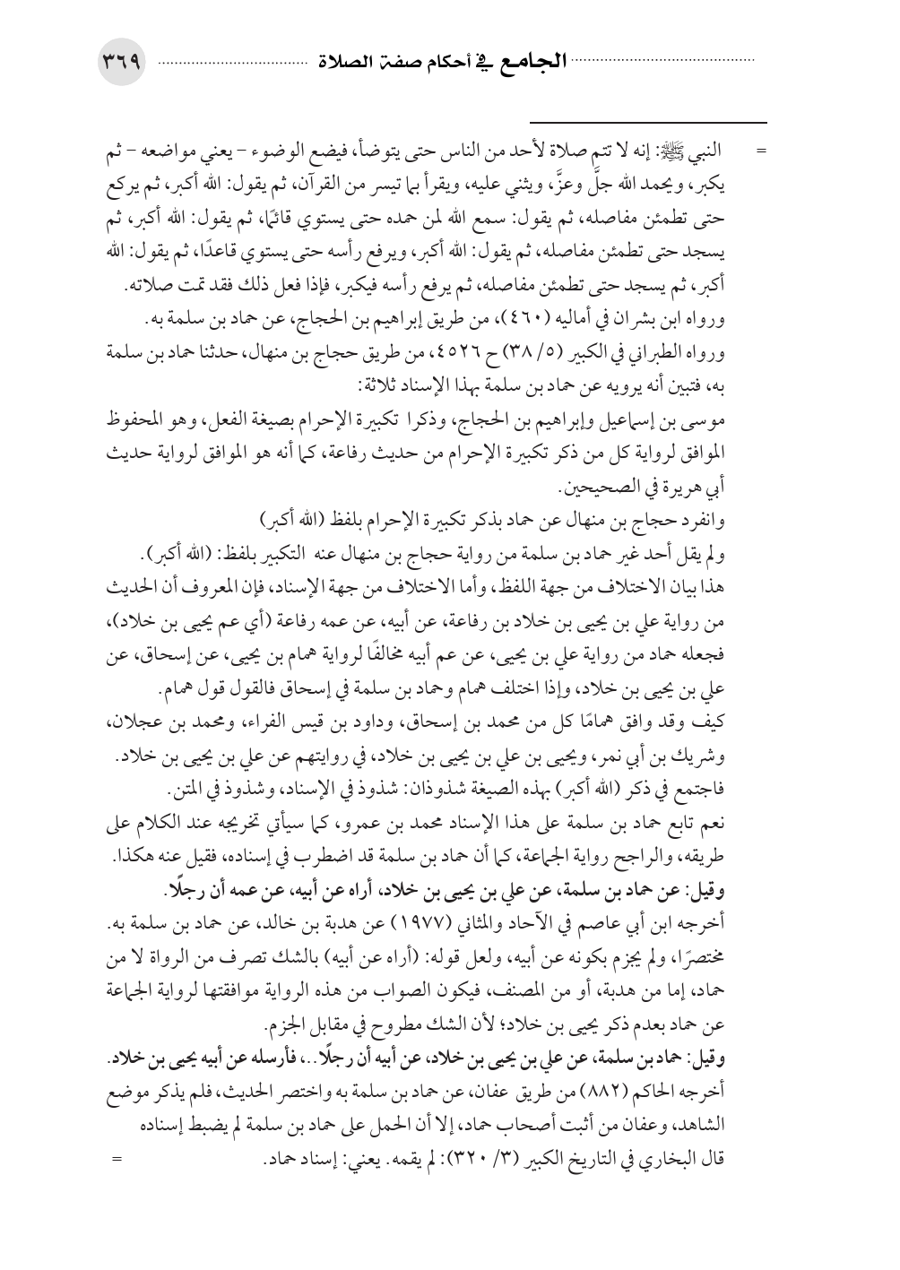 موسى بن إسماعيل وإبراهيم بن الحجاج، وذكرا تكبيرة الإحرام بصيغة الفعل، وهو المحفوظ الموافق لرواية كل من ذكر تكبيرة الإحرام من حديث رفاعة، كما أنه هو الموافق لرواية حديث أبي هريرة في الصحيحين.